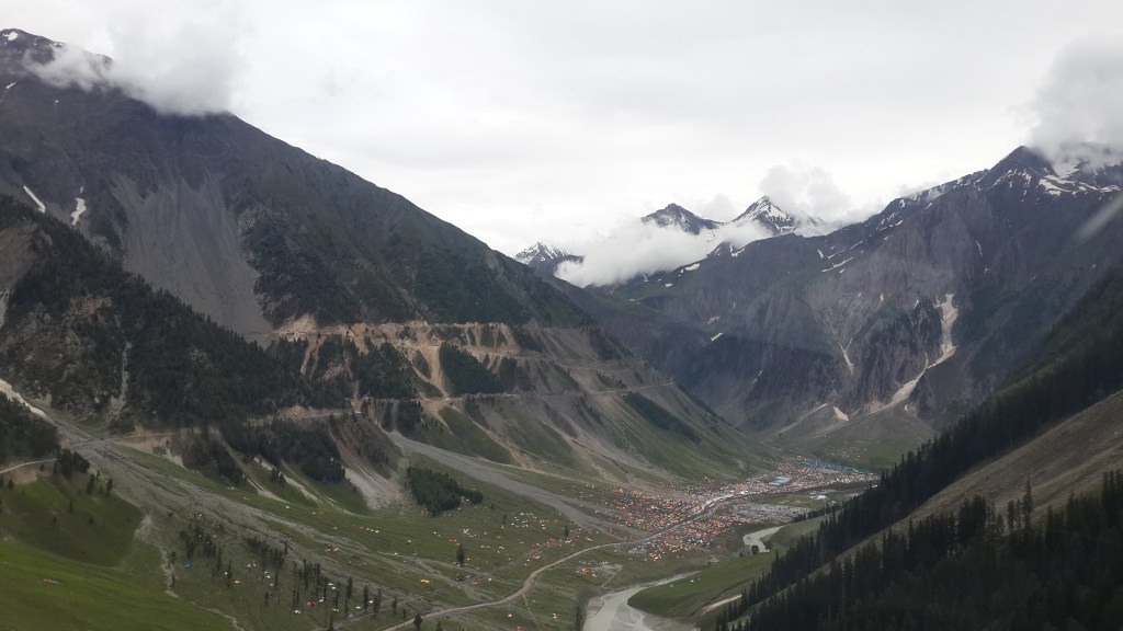 यात्रेला निघण्यापूर्वीचा दिवस पावसाळी उजाडला. सकाळी निद्रा देवीचा अंमल जातो न् जातो तोच लक्षात आले की, पहाटे पासून पावसाची संततधार चालू आहे. खोलीच्या मोठ्या काचांच्या तावदानातून पाहीले तर सूर्य कुठे तरी रूसून बसल्यागत ढगाळ वातावरण! वरूण राजाने सततचा चालविलेला अभिषेक! आणि पुंजक्या पुंजक्याने पहाडांशी, दरी-खोऱ्यात लगट करीत असलेले पांढुरके करड्या ढगांचे थवे! दिवसभर हा खेळ पहाण्याशिवाय कोणताही पर्याय नव्हता! खराब हवामानामुळे हया दिवशी बालताल मार्गे हेलिकॉप्टरची यात्रा देखील बंद ठेवण्यात आलेली असल्याचे कळले. आम्ही काश्मीरला पोहोचलो तेव्हा दोन दिवसांपूर्वी झालेल्या ढगफूटीमूळे पहेलगाम मार्गाकडील यात्रा पूर्णतः बंद करण्यात आलेली होती.