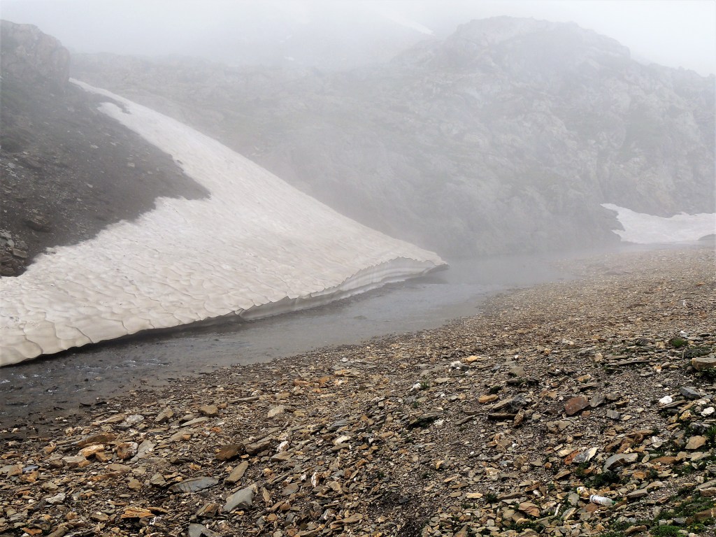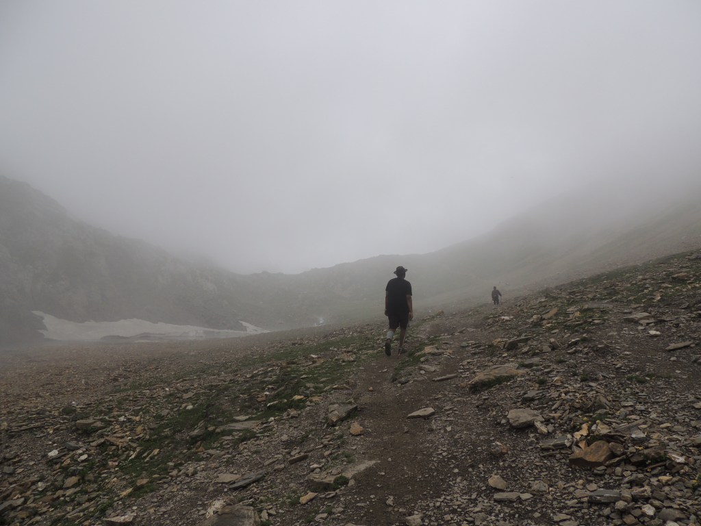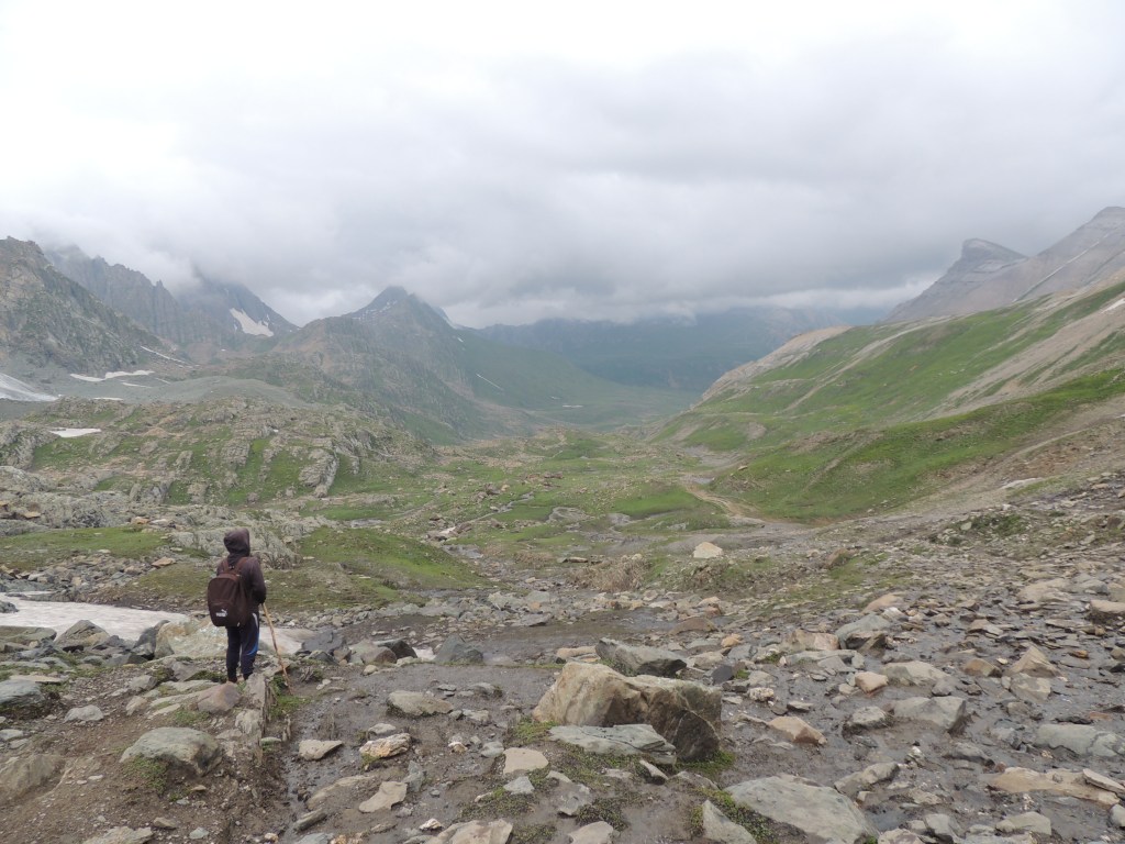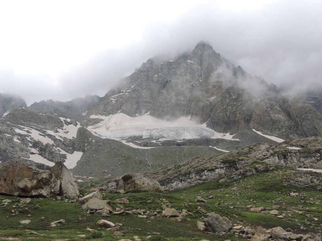 मी त्या चहाच्या टपरीवर पोहोचले तेव्हा ढगांमध्ये लुप्त झालेले ग्लेशिअर्स, पर्वतशिखरे काही सुध्दा दिसत नव्हते. फक्त हिम वितळून वाहणार्या पाण्याची खळखळ कानी येत होती. माझी मॅगी तयार होईपर्यंत त्या ‘घने बादलांनी’ पोबारा केला आणि क्षणार्धात टपरीच्या समोरचा परिसर आणि खिंडी पलीकडचा नजारा दिसू लागला. खूप तीव्र चढण पार करून आले होते हयाची जाणीव झाली. समोरच्या डोंगरावरून त्याच्या पायाशी लोळणी घेत पडलेले ग्लेशिअर्स आणि त्या खालून पाण्याचा प्रवाह आदल्या दिवशी मुक्कामाचा तळ असलेल्या कॅम्पच्या दिशेला वाहता झालेला होता. बस्स! एवढंच! पुन्हा “अगोबाई ढगोबाई” आक्रमण करून आले, आणि पुन्हा सारा आसमंत गडद धुक्याने व्यापून गेला. आणि फक्त माणसांच्या आकृत्या चालताना दिसू लागल्या. एव्हाना माझ्या पोटातल्या कावळ्यांची गरमागरम मॅगीने क्षुधाशांती झाली होती आणि काव्हा पिऊन तरतरी आलेली होती. सद्दामचा तोच परवलीचा शब्द कानी येऊन थडकला, ‘‘चलो चलो मॅडमजी”! प्रत्यक्ष खिंडीमध्ये दोहोबाजूंनी डोंगर आणि बर्फाची आच्छादने! ट्रेकर्सच्या अति वावराने त्या बर्फाचा जो काही चिखल झाला होता, तो अत्यंत धोकादायक होता! त्यामध्ये ट्रेकींग पोल अगदी खात्री होईपर्यंत स्थिर झाल्याशिवाय पाऊल उचलायचे नाही असा नियम घालून अगदी सावकाश त्या चिखल आणि बर्फातून पार झाले.