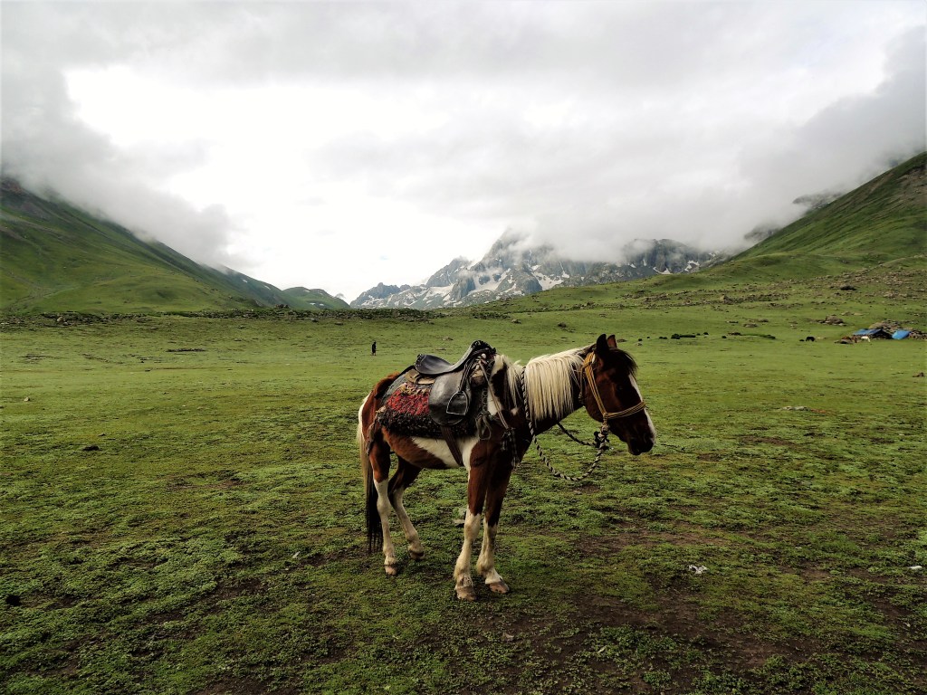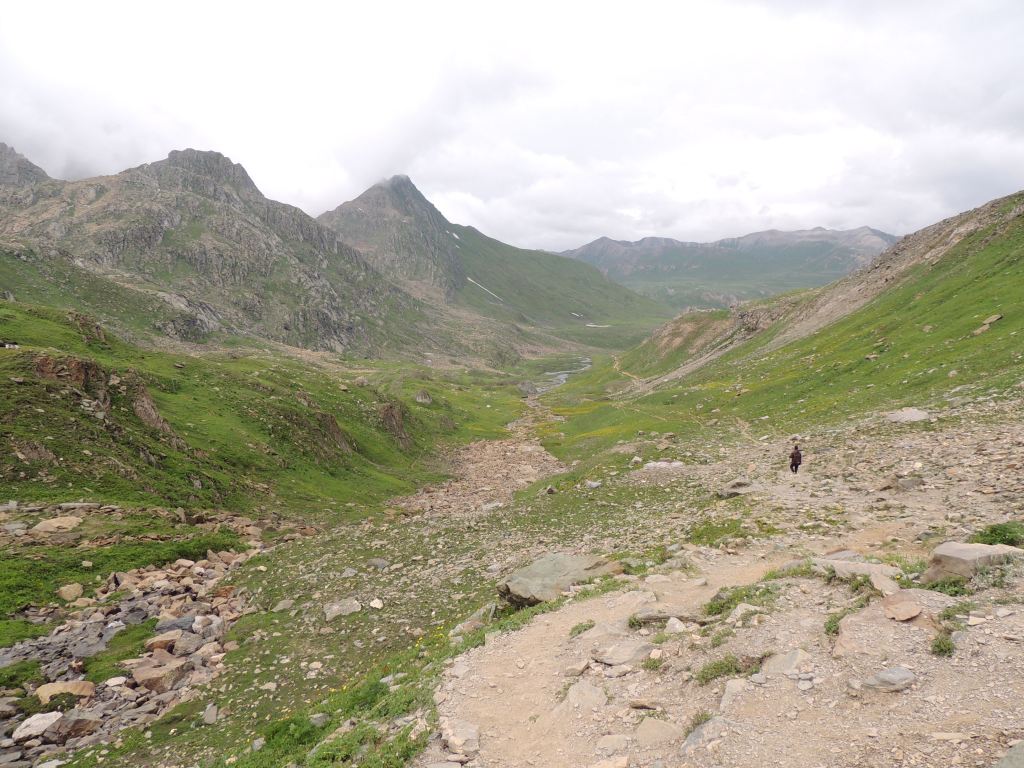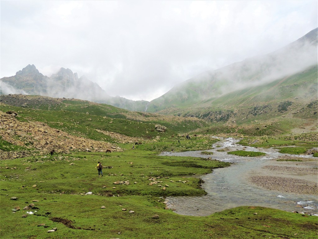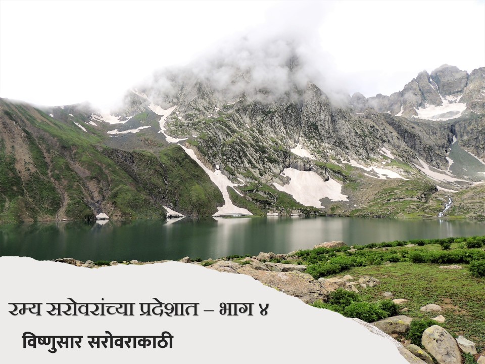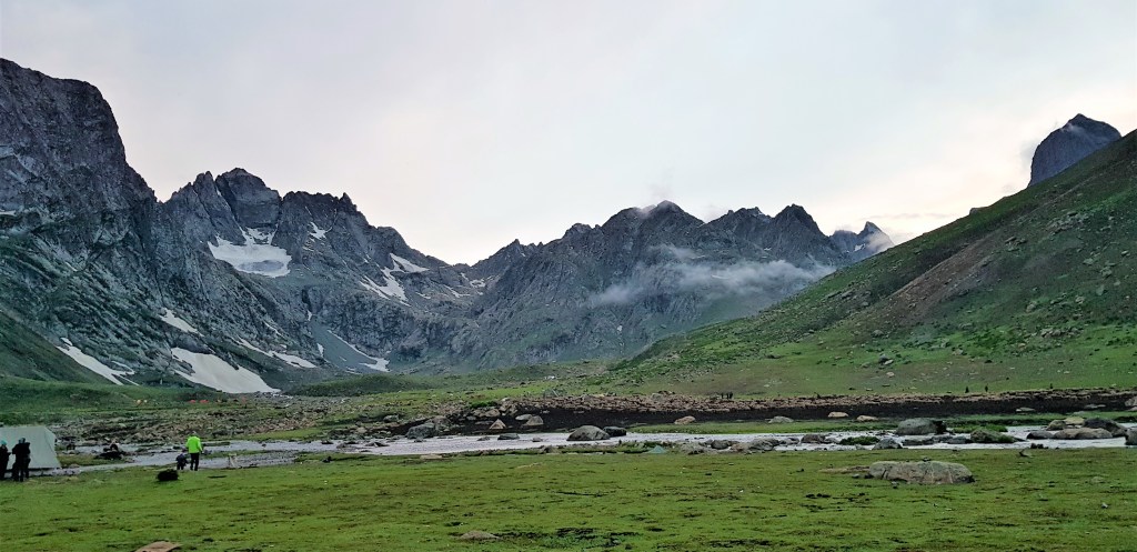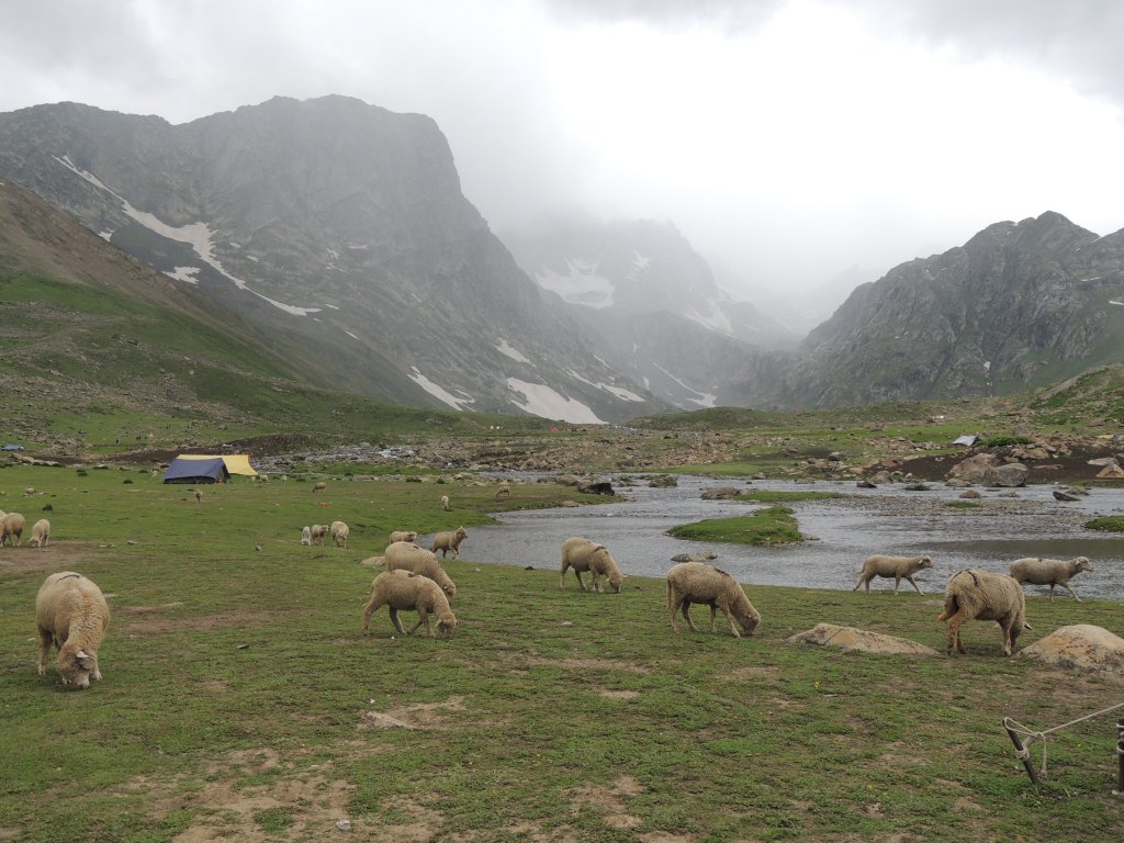 मला काही अंतरावर बालसुब्रमण्यम् त्यांच्या दोन ट्रेकिंग पोलच्या सहाय्याने चालताना नजरेस पडले. निळ्या रंगाच्या बरसाती आजूबाजूला दिसू लागल्या. मी आता ग्रुपमधील सदस्यांना गाठले, असा त्याचा अर्थ होता. हुश्श! पण सद्दाम भाई अद्यापही विष्णुसर कॅम्प दूर आहे अथवा जवळच आहे अशी कोणतीही वाच्यता करीत नव्हता. म्हणजेच चलते रहो! परंतु आता आम्ही सर्व छोट्या कंपूमध्ये एकत्र मौजमस्ती करीत चालत होतो. उजव्या-डाव्या हाताला पर्वतरांगा, त्यांच्या मधोमध विस्तीर्ण पसरलेली हिरवीगार कुरणे म्हणा अथवा गवताळ प्रदेश म्हणा! आणि मधोमध वाहणारी नदी! हया गवताळ प्रदेशात मनमौजी प्रमाणे मुक्तपणे संचार करीत असलेले शेळ्या-मेंढयांचे कळप! अजूनही ‘ग्रेट लेकस्’ नाव असलेल्या ‘तलावांची’ नजरभेट झालेली नव्हती. पण ज्या प्रदेशातून आम्ही चालत होतो तो मात्र खूपच सुंदर होता. आम्ही त्या दरीखोऱ्यांच्या अगदी शेवटच्या टोकाला आलो अन् आम्हाला खालच्या दिशेला युथ हॉस्टेल-विष्णुसर कॅम्पसाइटचे तंबू विसावलेले दिसले. विष्णुसार किंवा विशनसार तलावातून निर्गमित झालेल्या झऱ्यांच्या काठा-काठाने तंबू उभारले होते.