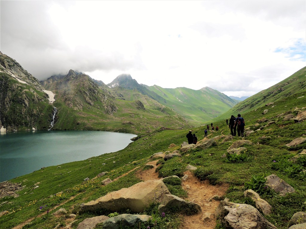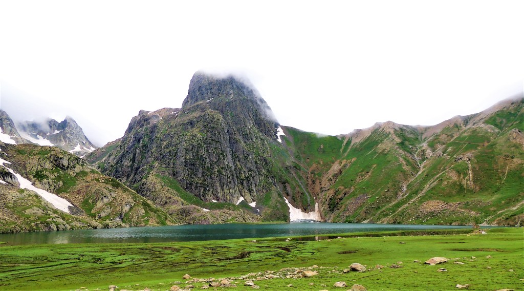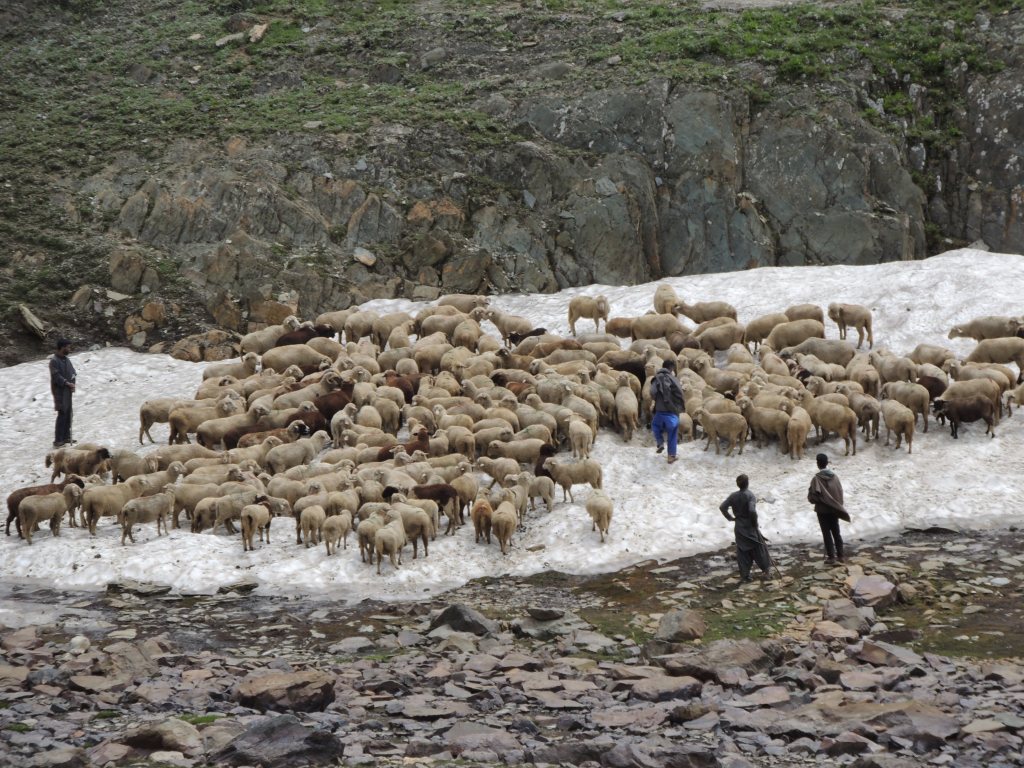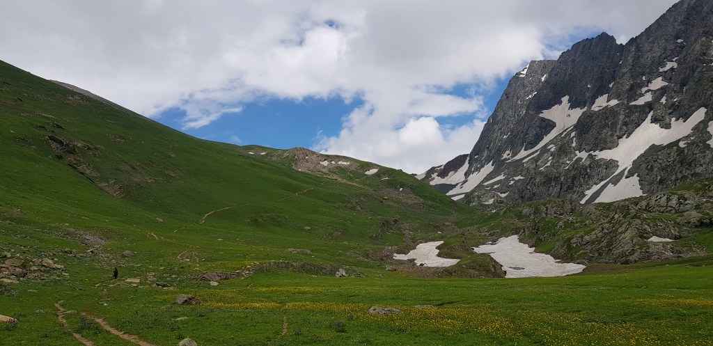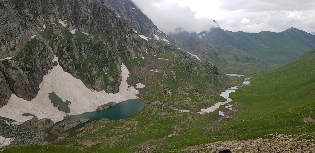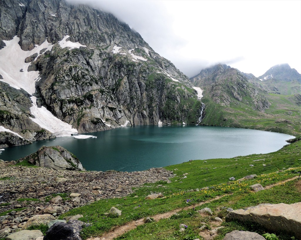 गडसर खिंडींच्या पल्याड बर्फ साचून रस्ता अदृश्य झाला होता. डाव्या बाजूला खडया पहाडांच्या अजस्त्र भिंती जणू! आणि उजव्या बाजूला हिरवीगार पसरलेली हिरवळ! अन् हयांच्या मधोमध नीलमण्यासारखे चमकणारे पाणी असणारे तलाव! त्यावर स्वैर पहुडलेले हिमनग आणि डोंगर रांगा आणि मिडोज् ह्यांच्यामधून उलगडत जाणारी विस्तीर्ण दरी-खोरी! दूर वर फिरोजी, नीलमणी रंगाचे ठिपके आता ‘ग्रेट लेकस्’च्या सान्निध्यात आल्याची जाणीव करून देत होते. गडसर खिंडीच्या तोंडाशीच साचलेल्या बर्फाने उतरण असणाऱ्या पायवाटेवर पाऊल टिकत नव्हते. भुसभुशीत रवाळ मातीवर पाय घसरत होता. अगदी छोटासा अवघड टप्पा पार करून आम्ही त्या सुंदर हिरवाईने समृध्द असलेल्या फुलांच्या मिडोजमधून जाणाऱ्या पायवाटेवर चालू लागलो. मला तर जणु खरोखरच क्षणभर स्वर्गामधील नंदनवनामध्ये अवतरल्यासारखं भासू लागलं! असीम निसर्ग सौंदर्याने परिपूर्ण असाच प्रदेश होता. हिम वितळून तयार झालेली ही स्फटिकासम भासणारी तळी आणि त्याच्या सभोवार हिरवीगार कुरणे आणि त्यावर सजलेली रंगीत जंगली फुले! तन-मन हरपून गेले अगदी! आज जणू कुठच्या तरी परिकथेतील प्रदेशात आल्याप्रमाणे वाटत होते. निसर्गाचे चित्तवेधक आविष्कार अगदी गुंगच करुन टाकत होते. बराचसा वेळ गडसर खिंडीशी सलगीने असलेल्या डोंगर रांगांतील पायवाटांवरुन आता उतरणीवर चालू लागलो. मध्येच पावसाने ‘‘येऊ का? असे भय दाखविल्यासारखा शिंतोडे उडवून गेला. सॅक मधून बरसाती काढून घालेपर्यंत ‘वाकुल्या’ दाखवित ‘छू मंतर’ सुध्दा झाला. पण त्या धांदलीमध्ये बरसातीमध्ये फार अवघडल्यासारखे होऊ लागले. कसेबसे उतरणीचा रस्ता पार करून पुन्हा काहीसा सपाट खोऱ्याचा भाग आला. रस्त्यामध्ये मेंढयांचे कळप जणू झुंडीने चालले होते. गंमतीचा भाग म्हणजे संपूर्ण कळपच्या कळप साठलेल्या बर्फावर एकत्र जमून उभा होता. त्यांच्या मागे बकरवाल हाकाटी करत होते. मध्येच एखादा जथ्था आमच्या पाऊलवाटेवर “रास्ता रोको” आंदोलन करत निवांत बसलेला असे.