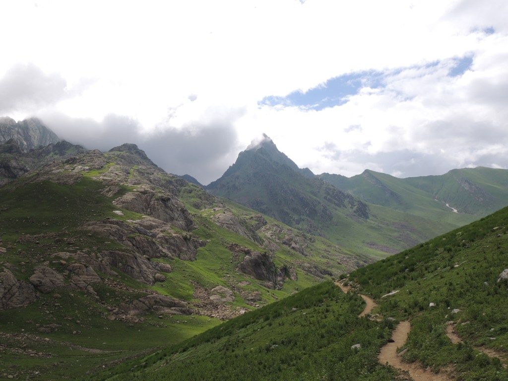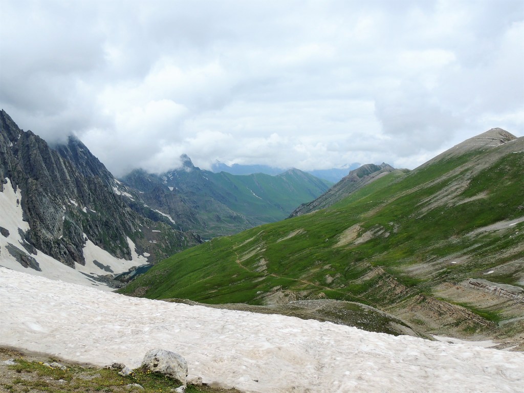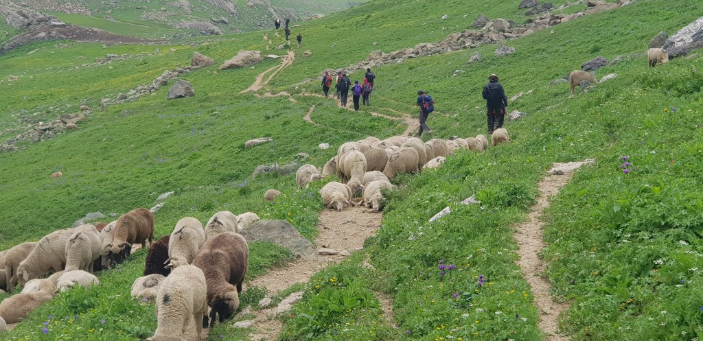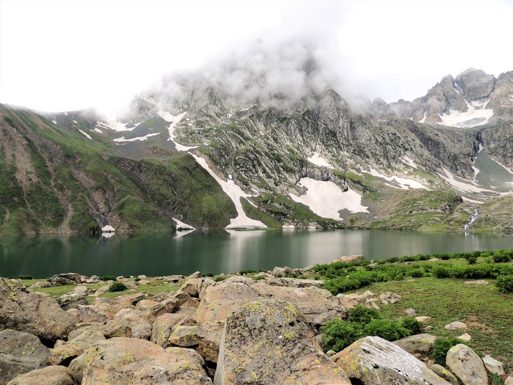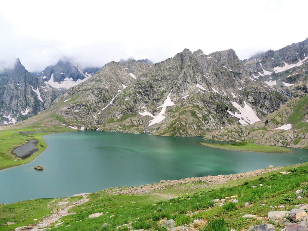 गडसर खिंडींच्या पल्याड बर्फ साचून रस्ता अदृश्य झाला होता. डाव्या बाजूला खडया पहाडांच्या अजस्त्र भिंती जणू! आणि उजव्या बाजूला हिरवीगार पसरलेली हिरवळ! अन् हयांच्या मधोमध नीलमण्यासारखे चमकणारे पाणी असणारे तलाव! त्यावर स्वैर पहुडलेले हिमनग आणि डोंगर रांगा आणि मिडोज् ह्यांच्यामधून उलगडत जाणारी विस्तीर्ण दरी-खोरी! दूर वर फिरोजी, नीलमणी रंगाचे ठिपके आता ‘ग्रेट लेकस्’च्या सान्निध्यात आल्याची जाणीव करून देत होते. गडसर खिंडीच्या तोंडाशीच साचलेल्या बर्फाने उतरण असणाऱ्या पायवाटेवर पाऊल टिकत नव्हते. भुसभुशीत रवाळ मातीवर पाय घसरत होता. अगदी छोटासा अवघड टप्पा पार करून आम्ही त्या सुंदर हिरवाईने समृध्द असलेल्या फुलांच्या मिडोजमधून जाणाऱ्या पायवाटेवर चालू लागलो. मला तर जणु खरोखरच क्षणभर स्वर्गामधील नंदनवनामध्ये अवतरल्यासारखं भासू लागलं! असीम निसर्ग सौंदर्याने परिपूर्ण असाच प्रदेश होता. हिम वितळून तयार झालेली ही स्फटिकासम भासणारी तळी आणि त्याच्या सभोवार हिरवीगार कुरणे आणि त्यावर सजलेली रंगीत जंगली फुले! तन-मन हरपून गेले अगदी! आज जणू कुठच्या तरी परिकथेतील प्रदेशात आल्याप्रमाणे वाटत होते. निसर्गाचे चित्तवेधक आविष्कार अगदी गुंगच करुन टाकत होते. बराचसा वेळ गडसर खिंडीशी सलगीने असलेल्या डोंगर रांगांतील पायवाटांवरुन आता उतरणीवर चालू लागलो. मध्येच पावसाने ‘‘येऊ का? असे भय दाखविल्यासारखा शिंतोडे उडवून गेला. सॅक मधून बरसाती काढून घालेपर्यंत ‘वाकुल्या’ दाखवित ‘छू मंतर’ सुध्दा झाला. पण त्या धांदलीमध्ये बरसातीमध्ये फार अवघडल्यासारखे होऊ लागले. कसेबसे उतरणीचा रस्ता पार करून पुन्हा काहीसा सपाट खोऱ्याचा भाग आला. रस्त्यामध्ये मेंढयांचे कळप जणू झुंडीने चालले होते. गंमतीचा भाग म्हणजे संपूर्ण कळपच्या कळप साठलेल्या बर्फावर एकत्र जमून उभा होता. त्यांच्या मागे बकरवाल हाकाटी करत होते. मध्येच एखादा जथ्था आमच्या पाऊलवाटेवर “रास्ता रोको” आंदोलन करत निवांत बसलेला असे.