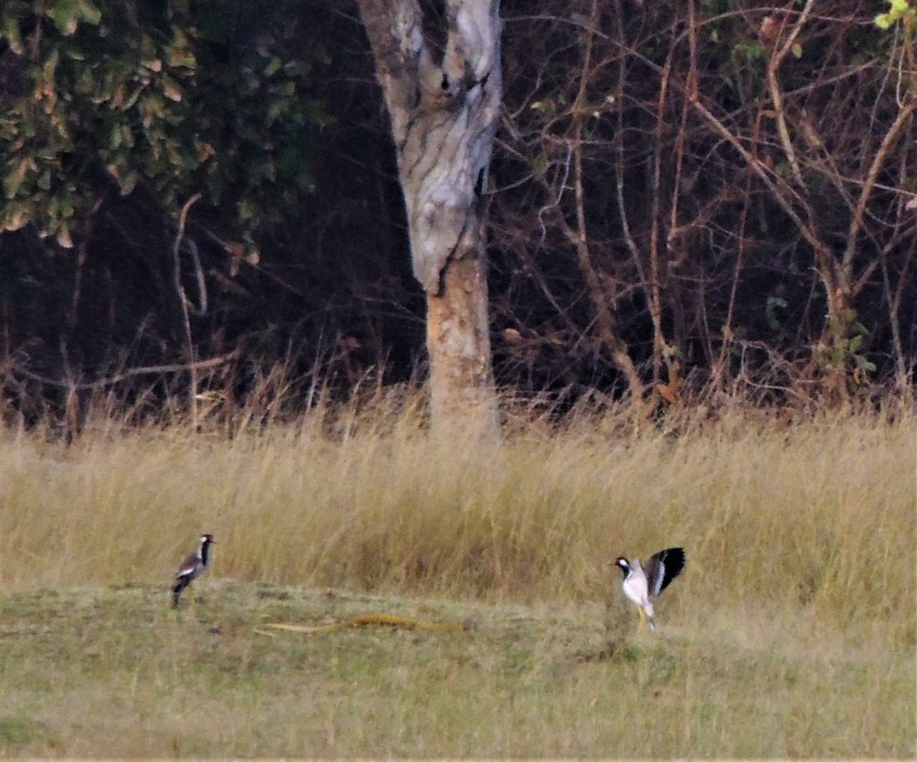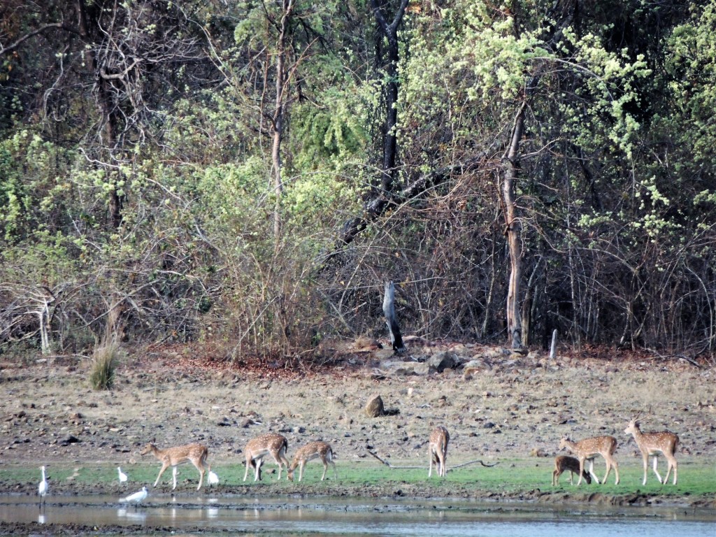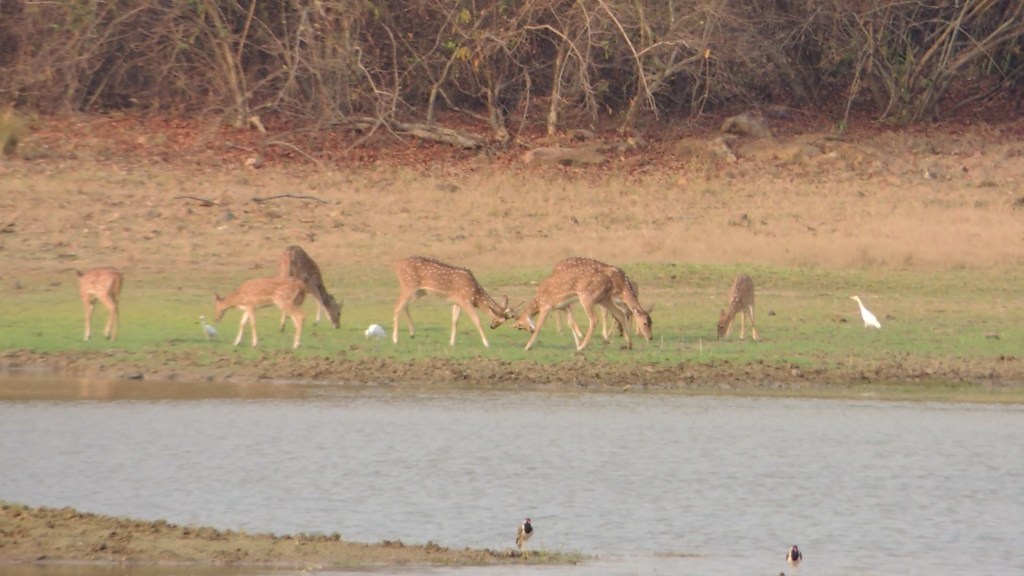 आम्ही अगदी जिप्सीमध्ये सरसावून डोळ्यांचे भिंग करून बसलो होतो. पण बहुधा स्वारी खूष नव्हती आमच्यावर! चार तास जंगल पालथं घातलं तेव्हा महाराजांनी पाठमोरे दर्शन दिले! पण काय रूबाब! वाघोबा महाराज त्यांची शतपावली करीत निघून जाईपर्यंत आम्ही त्यांना पाठमोरे पाहत राहिलो! तिथून आमची जिप्सी जसे आमच्या चालकाला कळवले जाई तसे जंगलाच्या रस्त्यावरून सर्व व्याघ्र कुटुंबांच्या दर्शनासाठी फिरत राहिली! आम्ही एक पाणवठ्याच्या जवळ बराच वेळ थांबलो. खरंतरं गाडीमधून खाली उतरण्यास परवानगी नसते. पण आम्ही तिथे थांबलो. तिथे झाडावर मचाण बांधलेले होते. ह्या ठिकाणांवरून खूप पक्षी दिसले. पलीकडच्या तीरावर हरिणांचे कुटुंबच बागडत होते. माझ्या कॅमेराने विलक्षण दृष्य टिपले, दोन पक्षी एका सर्पाची शिकार करण्यास टपून बसले होते! आम्ही जंगल सफारीमध्ये छान रमलो! जंगल भेटीनंतर पुन्हा रिसोर्टवर येवून आनंदवनाकडे निघण्याची लगबग चालू झाली. दुपारचे जेवण उरकून आम्ही आनंदवनाकडे निघालो. संध्याकाळी आनंदवनात पोहोचलो.