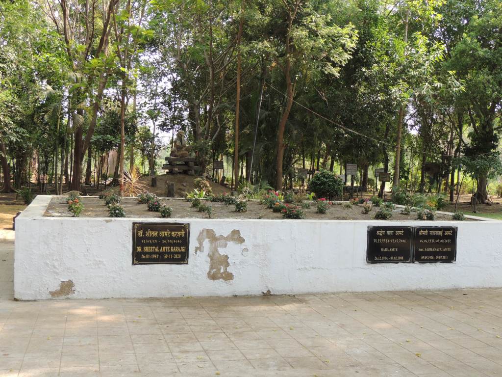 दुसर्या दिवशी सकाळी लवकरच आम्ही आनंदवनाचा निरोप घेण्याआधी बाबा आमटे, साधनाताई आणि त्यांची नात शीतल जिथे चिरनिद्रा घेत पहुडलेत त्या स्मारकाला भेट दिली. तिथेच बाबा आमटेंची ‘भारत जोडो’ अभियानामध्ये वापरलेली बस शेडमध्ये आठवणीखातर उभी दिसते. पाठीच्या दुखण्यामुळे बाबा आमटे बऱ्याचवेळी झोपून प्रवास करीत असत. त्यासाठी हया बसचा वापर केला जात असे.