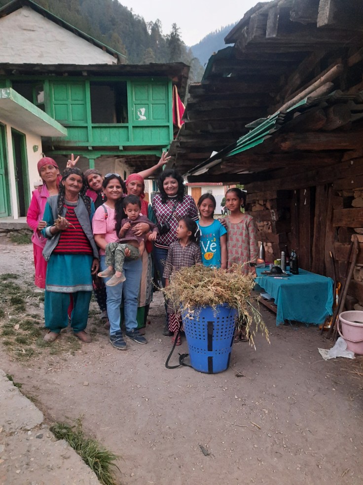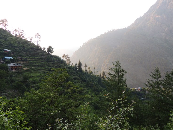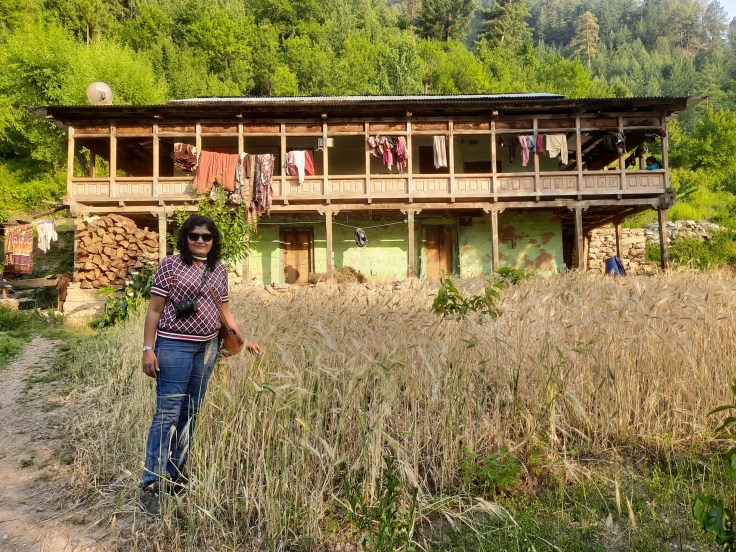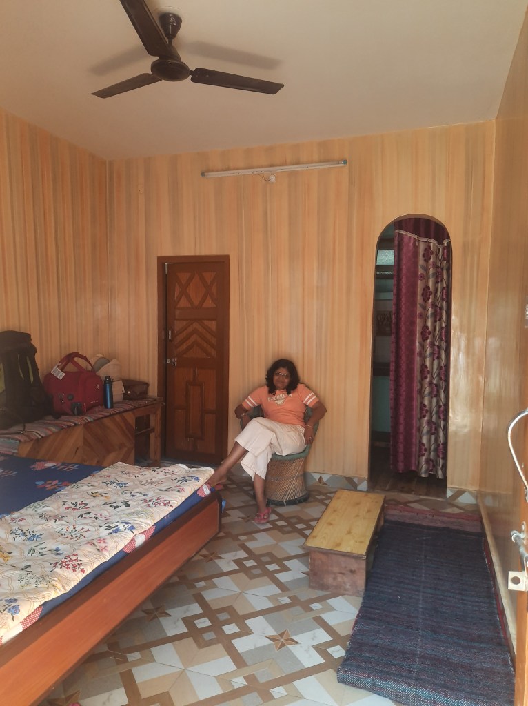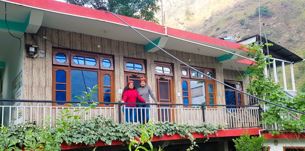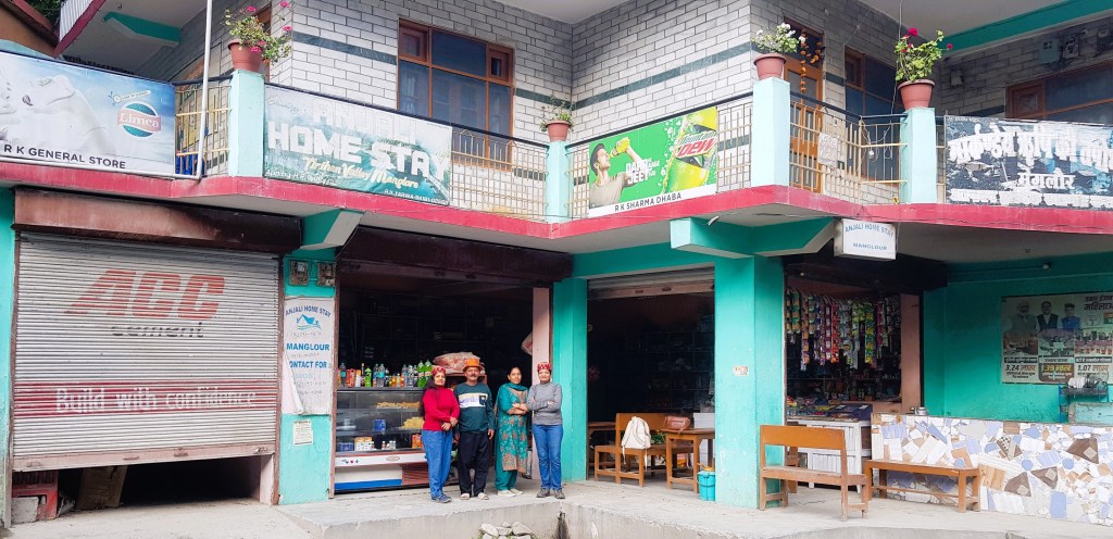 औटपासून साधारण ३० किलोमीटरच्या अंतरावर मंगलोर गाव आहे. आम्ही अंदाजे पाऊण तासामध्ये आमच्या इच्छित ठिकाणी पोहोचलो. आमची बस मंगलोर गावाच्या एका वळणावर एका दुकानासमोर थांबली आणि आमचा बस चालक म्हणाला, मॅडमजी, चलो आ गया आपका ठिकाना! आम्ही बसमधून उतरत असताना लगबगीने एक मुलगा धावत आला आणि आमच्या हातामधील सामान घेऊन आम्हाला दुकानामध्ये घेऊन गेला. आम्ही दिसताच दुकानाचे मालक श्री रामकिशनजी आणि त्यांच्या पत्नीने अगदी हसतमुखाने आमचे स्वागत केले. माझी चौकस नजर सभोवार फिरली. मुख्य रस्त्यावर रामकिशनजींचे दुकान होते, त्यावर त्यांचे स्वतःचे घर! अगदी “नीचे दुकान, उपर मकान” या उक्तीप्रमाणे! आणि त्याच्या मागच्या बाजूस वरच्या टप्प्यावर गेस्ट हाऊससाठी त्यांनी बांधकाम केलेले होते. दुकानामध्ये किराणा सामान आणि एका कोपऱ्यात छोटा चुल्हा होता, जिथे खाद्य पदार्थ बनविले जात होते. आम्हाला तिथेच बाकड्यावर बसवून त्यांनी चहा दिला. प्रवासाचा तपशील आणि ओळख वगैरे उपचार झाल्यावर आम्हाला आमच्या खोलीकडे घेऊन गेले. खरं तर पहाडांमध्ये डोंगर उतारावर ही गावे वसलेली असतात. त्यामुळे गावातील घरे देखील टप्प्यांमध्ये असतात. दुकानाच्या बाजूनेच वरच्या दिशेला जाणारा उंच पायऱ्यांचा जिना होता. त्यावरून पहिल्या टप्प्यात उजव्या बाजूला रामकिशनजींचे घर होते आणि त्याच बाजूने वरच्या टप्प्यामध्ये आमची खोली होती. ह्या दोन टप्प्यांमध्ये किचन गार्डन होते. आणि आमच्या गेस्ट हाऊसच्या बाल्कनीमधून डाव्या बाजूने वरच्या दिशेला गेस्ट साठी डायनिंग रूम सदृश व्यवस्था होती. मला डायनिंग व्यवस्था मनाला खूपच भावली कारण तिथे बसून मोठ्या उघड्या खिडक्यांमधून आजूबाजूचा निसर्गरम्य परिसर दिसत होता.