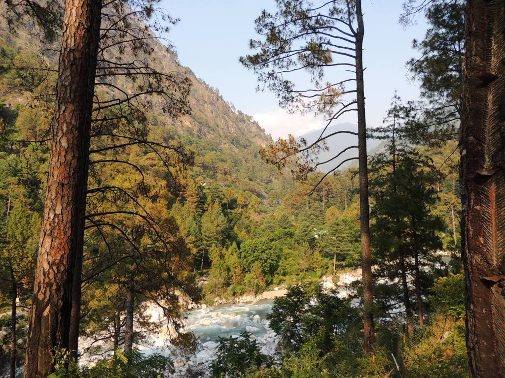 आमची सवारी छोई धबधब्याकडे निघाली. रस्त्यामध्येच ग्रेट हिमालयन नॅशनल पार्कचा वनराजीचा परिसर आहे. पर्यटक ह्या फॉरेस्ट कॉम्प्लेक्समधून पायी चालत वनराजीचा मनमुराद आनंद घेऊ शकतात. रस्त्याच्या एका बाजूला हा फॉरेस्ट कॉम्प्लेक्स आणि दुसऱ्या बाजूला खाली खळखळ नाद करीत वाहणारी “तीर्थ” नदी! आम्ही ग्रेट हिमालयन नॅशनल पार्कच्या परिसरामध्ये काही वेळ व्यतीत करून पुढे निघालो.