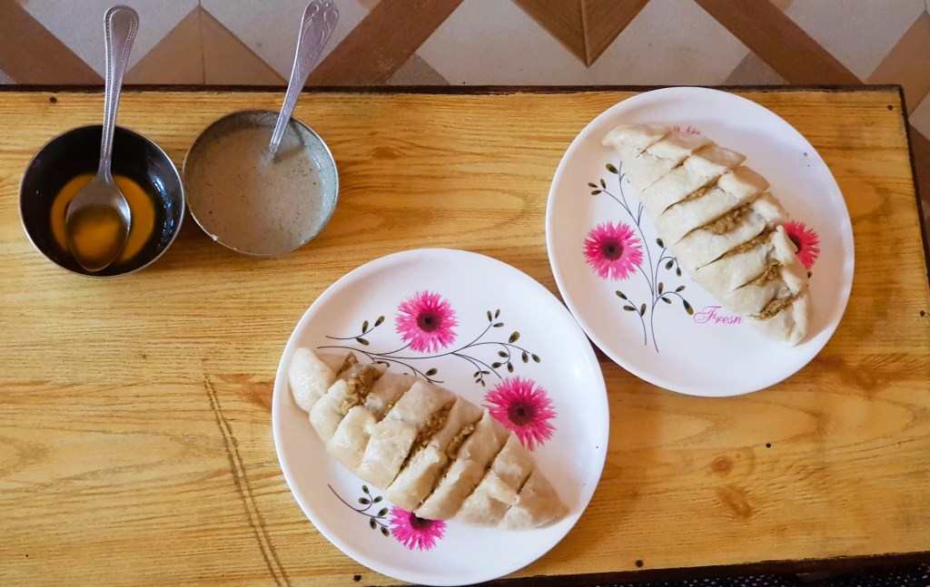 आमची खोली अगदी साधी, पण मूलभूत सोईनी युक्त होती. डबल बेड, स्वच्छ बाथरूम, आणि एक छोटी स्वयंपाक खोलीची जागा! आम्हाला त्याचे जास्त कुतुहल वाटले. कोरोंना संक्रमणाच्या काळात बरेच जणांनी “वर्क फ्रॉम होम”चा पर्याय निवडून “वर्क फ्रॉम माउंटेन्स” नावारूपाला आले! त्या काळात अनेक पहाडी गावांमध्ये ‘होम स्टे’ ची संकल्पना आकार घेऊ लागली. पर्यायाने स्थानिक लोकांनी त्याला आपल्या उत्पन्नाचे साधन बनविले. रामकिशनजींकडून कळले की काही पर्यटक-पाहुणे कुटुंबासह महिनाभर वस्तीस होते. त्या अनुषंगाने त्यांनी स्वयंपाक खोलीची योजना केलेली होती. जे पाहुणे स्वतः काही बनवू इच्छितात त्यांच्यासाठी ते स्टोव्ह, भांडी उपलब्ध करून देतात. आम्ही आमच्या खोलीत स्थिरस्थावर होईपर्यंत आम्हाला आमच्या खोलीतच श्याम भेेय्या नाश्ता घेऊन आले. आणि आम्ही दोघी एकदम खुष झालो कारण आमच्यासाठी पारंपरिक हिमाचली “सिद्दू” बनविलेले होते. गव्हाच्या पिठापासून बनवलेल्या करंजी सारख्या आकारात भाज्यांचे सारण भरून वाफवलेला पदार्थ म्हणजे “सिद्दू”! अत्यंत पौष्टिक आणि चवीष्ट! सिद्दू तूप आणि अक्रोड चटणी सोबत फारच अफलातून लागले. होमस्टेमध्ये आपण ज्या ठिकाणी जातो, तेथील जनजीवन, लोककला, खाद्य परंपरा ह्या बाबीची अगदी जवळून तोंडओळख होते! मग लक्षात येते की, निसर्ग भौगोलिक दृष्ट्या जसा वेगवेगळा होत जातो तसतसे खाद्य परंपरा, राहणीमान देखील त्यानुसार स्वीकारले जाते. आम्ही नाश्ता करून, आंघोळ वगैरे आटोपून विश्रांती घेतली. रात्रभराच्या प्रवासाचा शीण होताच! परंतु रामकिशनजींच्या आदरातिथ्याने थकवा पळून गेला. दुपारच्या जेवणाची सोय अंजली होमस्टेच्या डायनिंग रूममध्ये केलेली होती. आम्ही तिथे खऱ्या अर्थाने निवांत झालो. अजूनही काचेची तावदाने न लावलेल्या मोठाल्या खिडक्यांमधून तीर्थन व्हॅली मधील छोटे मंगलोर गाव दिसत होते. दूर अंतरावरून शाळेमध्ये चाललेली मुलांची ‘परेड’ दिसत होती. शाळेच्या पुढे काही अंतरावर खाली तीर्थन खोऱ्यातून वाहणारी “तीर्थन” नदीचे पात्र दिसत होते. होमस्टेच्या मागची बाजू डोंगर-कपारीने जणू संरक्षक भिंती सारखी सांभाळलेली होती. मंद हिमालयीन हवेच्या झुळुका अनुभवत आम्ही दुपारचे जेवण उरकून घेतले आणि रामकिशनजींच्या सल्ल्यानुसार आम्ही विश्रांती घेऊन दुपारनंतर भटकंतीसाठी जायचे ठरविले. आमच्यासाठी त्यांनी त्यांच्याच नातेवाईकाच्या रेंटल कारची देखील व्यवस्था केली. आमच्या तीर्थन व्हॅलीच्या भटकंतीसाठी रामकिशनजींचा भाचा उत्तम त्याची गाडी घेऊन आमच्या होमस्टेवर आला. आम्ही त्याला आमचा “उत्तम भैय्या” करून टाकले! साधारण साडेतीन-चारच्या सुमारास आम्ही जवळपासचा परिसर पाहण्यासाठी निघालो.