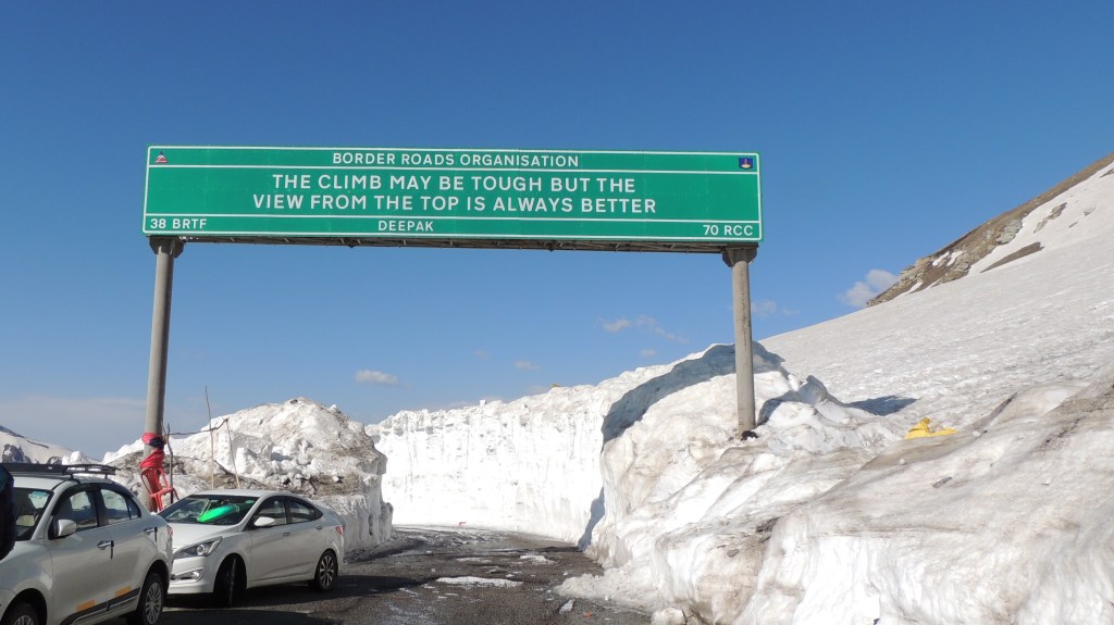 संध्याकाळी गप्पांच्या ओघात रोहतांग पास काही दिवसांपूर्वीच रहदारीसाठी खुला झालेला आहे असे कळले. बर्फाच्या दुतर्फा भिंती आणि त्यामधून होणारी वाहतूक हे थोडं आपल्याला समुद्रसपाटीवर राहणाऱ्याना कुतुहलाचं! दुसऱ्या दिवशी संध्याकाळी आमचे दिल्लीकडे जाणाऱ्या बसचे बूकिंग झालेले होते. त्यामुळे संध्याकाळपर्यंतचा वेळ आमच्या हाती होता. आम्ही रोहतांग पासला भेट देऊन यायचे ठरविले. बऱ्याच खटाटोपानंतर आमची रेंटल कारची व्यवस्था झाली. पण त्यासाठी आम्हाला मध्यरात्री पावणेतीन वाजता गाडीच्या ड्रायव्हरने तयार रहाण्यास सांगितले. आम्ही अगदी मध्यरात्री पावणे तीन वाजता गाडी आणि ड्रायव्हरची वाट पाहात होमस्टेच्या बाहेर गार हवेत उभ्या राहिलो. आमची झोप उडवून ड्रायव्हर महाशय चक्क एक तास उशिरा आला. एवढ्या थंड हवेतही आमचा पारा चढला! आमच्याशी हुज्जत घालतच त्याने गाडी रोहतांग पासच्या दिशेने हाकली. ज्या पध्दतीने ड्रायव्हर गाडी चालवत होता, ते पाहून आम्ही सुखरूप परत जाऊ ना? अशी शंका येऊ लागली. रोहतांग पासकडे जाण्यासाठी परमीट काढावे लागते. त्याने चक्क आम्हाला परमीट काढून ठेवले आहे ह्याबाबत थाप मारलेली होती. एका ठिकाणी आमची गाडी इतर गाड्यांसोबत बाजूला थांबली. आमचा ड्रायव्हर आम्हाला सांगू लागला की, पुढे जाण्यासाठीचे परमीट घेऊन कोणीतरी येत आहे. इतक्या पहाटे पेंगुळेलेल्या अवस्थेत त्याच्याशी हुज्जत घालण्याची आमची क्षमता संपलेली होती. आता आपणच ठरवले आहे ना, रोहतांगला जायचे! मग काय आलिया भोगासी असावे सादर! काही वेळातच काही कागद घेऊन माणसे आली, त्यांनी पटापट गाडी चालकांकडे परमीट दिले आणि गाड्या रोहतांग पासच्या वळणावळणाच्या खिंडीच्या रस्त्यावर धावू लागल्या. भयानक वाहतूक कोंडी झालेली होती. आम्ही केवळ ५१ किलोमीटर अंतर तब्बल चार तासामध्ये पार करून सकाळी आठ वाजता रोहतांग खिंडीपाशी पोहोचलो.