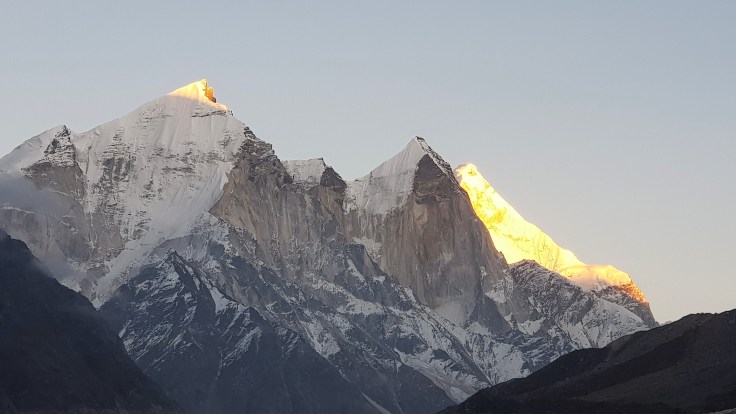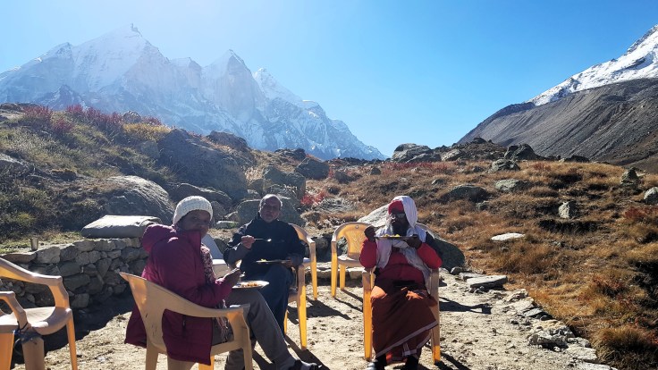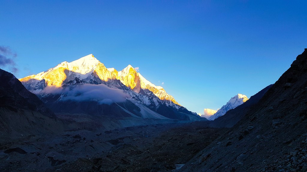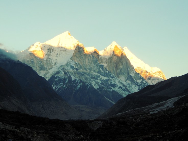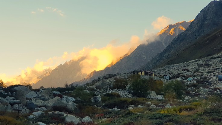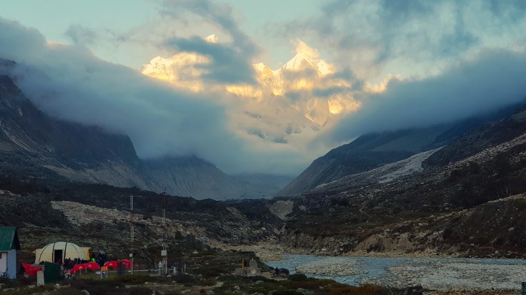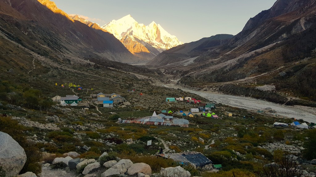 आम्ही चहा घेऊन कॅम्प परिसरात टेहळणी करू लागलो. संपूर्ण परिसर पर्वत रांगांनी वेढलेला होता. सायंकाळी सूर्य देव परतण्याच्या बेतात होता, समोर भागीरथी शिखरांवर जणू सुवर्णाचा मुलामा द्यावा त्याप्रमाणे एका मागोमाग एक तिन्ही शिखरे चमकू लागली. मंत्रमुग्ध करणारा नजारा होता. प्रत्येक क्षणाला त्या रंगाच्या उधळणीचे फोटो काढण्याची धडपड सुरू होती, पण शेवटी ‘ह्याची देही ह्याची डोळा’ ही अनुभूति महत्त्वाची आणि ती मनामध्ये चिरंतन सुद्धा राहते. कॅमेरा आणि मोबाईल दोन्ही जॅकेटच्या खिशात कोंबून एकटक निसर्गाची अप्रतिम कलाकुसर पाहात राहिले! सूर्यास्त झाल्याने वातावरणामधील गारठा जाणवू लागला आणि अंधारून आल्याने तंबूच्या दिशेने धाव घेतली. तितक्यातच आम्हाला जेवणासाठी बोलविले. छोट्या ग्रुपमधे कॅम्पमधील सर्व पाहुण्यांना विभागून त्या छोट्याश्या दगडी झोपडीवजा स्वयंपाक घरात बोलविले जात होते. आम्ही जेवण करून तंबूत शिरलो. गप्पा-गोष्टी करीत कधी झोपेच्या अधीन झालो कळले सुद्धा नाही!