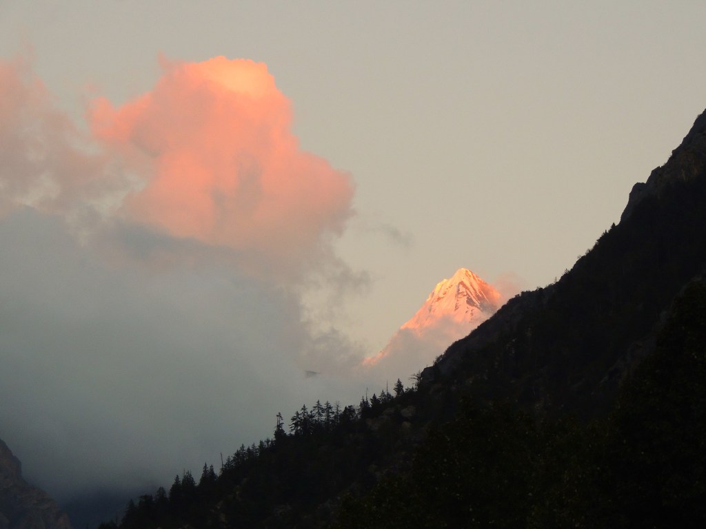 संध्याकाळी चहाच्या वेळेपर्यंत विलास आणि मंडळी सुद्धा आली. विलासचे मित्र श्री. जगदीश नाईक, त्यांची पत्नी अनिता गोखले, श्री. अमोल भागवत हे सर्व नुकताच निवृत्त झालेले होते. त्यांच्याशी परिचय करून घेतला आणि आम्ही सर्व अगदी सहजपणे रुळलो. त्यांनी त्यांचे यमुनोत्री इतिवृत्त सांगीतले आणि माझी हकीकत ऐकून आश्चर्य चकित झाले! संध्याकाळच्या चहानंतर आम्ही सर्व गंगोत्री मंदिराच्या दिशेने चालत निघालो. गंगोत्री मंदिर परिसरातून सूर्यास्ताचे दृश्य फार छान दिसत होते. सुदर्शन पर्वत शिखरावर आपल्या रंगछटेचे प्रदर्शन करीत सूर्य देव माघारी परतत होते.
