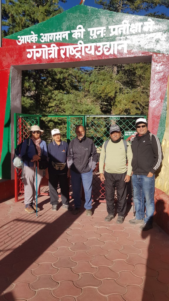 आम्ही जंगलातून पाईन वृक्षांच्या छायेतून पुढे आलो. थोडी उघडीप मिळाली आणि गंगोत्री मंदिरातील घंटेचा दुरून येणारा नाद कानात गुंजला. गंगोत्री मंदिरामध्ये सकाळच्या पूजा-अर्चेला सुरुवात झाली असावी! मागे वळून पाहताच सुंदर दृश्य नजरेस पडले! चौफेर पर्वत रांगांनी वेढलेल्या गंगोत्रीमधील मनुष्य वस्तीसाठी बांधलेल्या घरांची लाल-हिरवी छप्परे, मधोमध सफेद रंगाचे गंगा मैयाचे मंदिर, सदैव बर्फाने आच्छादीत असल्याने बोडक्या पर्वत शिखरांच्या कुशीत खेटून आकाशाकडे उंच पहाण्याची स्पर्धा करीत असलेले फर, स्प्रूस, देवदार वृक्ष! स्वच्छ निळ्या आकाशाच्या पार्श्वभूमीवर त्याच उघड्या- बोडक्या पर्वत शिखरांवर सूर्य किरणांचा अलगद वर्षाव होताच, ती शिखरे सुवर्णभस्मासारखी चमकू लागली! खूपच मंत्रमुग्ध करणारा नजारा होता. समोरच्या पर्वत शिखरांवर आपली अभा फेकत सूर्यदेवाने दर्शन दिले. भोजबासाकडे जाणाऱ्या वाटेवरचा पहिला टप्पा खूपच निसर्गरम्य आहे. साधारण २ ते ३ किलोमीटर अंतर चालून गेल्यावर आम्ही गंगोत्री राष्ट्रीय उद्यानाच्या प्रवेशद्वारापाशी पोहोचलो. तिथे आमचे ट्रेक परमीट आणि ओळखपत्र इत्यादी तपशील घेतले गेले. ह्या ठिकाणी कॅमेरा वगैरे वस्तूंसाठी असलेले शुल्क अदा करावे लागते. प्रवेशद्वाराजवळ सर्व सूचना आणि माहिती तपशीलवार फलकांवर सूचित केलेली आहे. आता खऱ्या अर्थाने आम्ही ट्रेक रूटवर प्रवेश केला होता! ह्या गंगोत्री-गौमुख मार्गावर पॉलिथिन नेणे वर्जित आहे. अगर आपल्याकडे काही पॉलिथिन बॅग्स् किंवा तत्सम गोष्टी असतील तर त्या पुन्हा आपल्याला परत आणणे क्रमप्राप्त आहे. हा उपक्रम अगदीच योग्य वाटला. ट्रेक असो अथवा तीर्थयात्रा, हिमालयात पर्यटनामुळे होणाऱ्या कचऱ्याचे विघटन करणे जिकिरीचे होत आहे आणि पर्यावरणास देखील घातक ठरत आहे. सर्वात महत्त्वाचे म्हणजे तेथील अधिकारी सर्वाना कळकळीने सूचना देत होते की कोणालाही अति उंचावर गेल्याने विरळ हवेमुळे त्रास होऊ लागला तर त्या ठिकाणाहून पुन्हा परतीचा प्रवास सुरू करावा! कारण पुढे सर्व प्रदेश अगदीच दुर्गम आणि कोणतीही वैद्यकीय सेवा मिळणार नाही असाच होता!