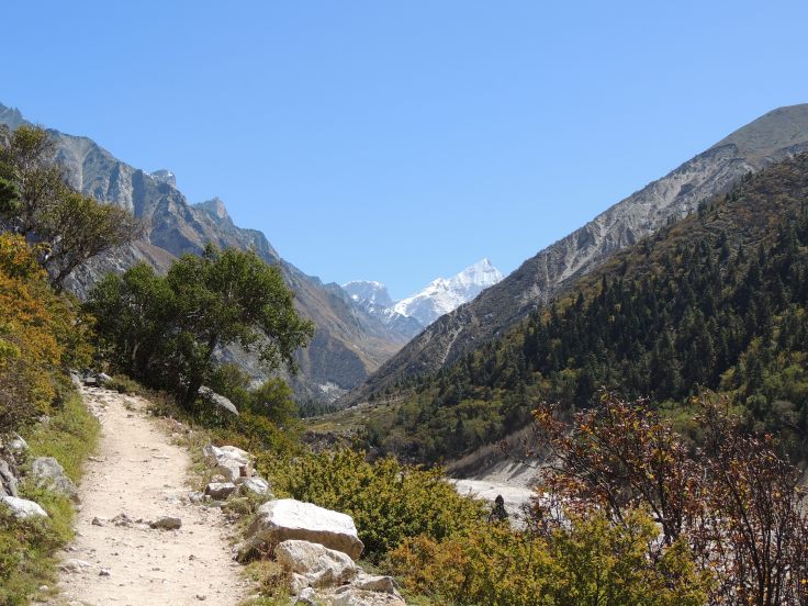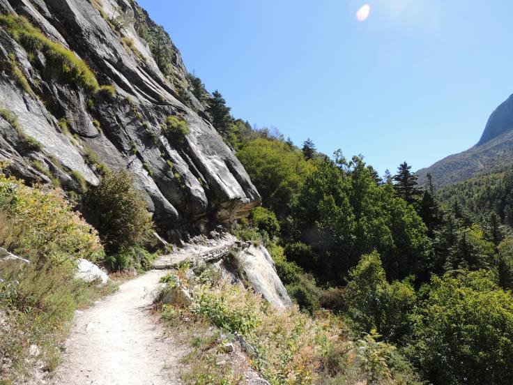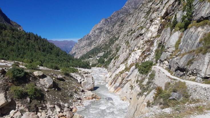 आमचा खऱ्या अर्थी ट्रेकचा पहिला दिवस उजाडला! आम्ही सकाळी लवकर तयार होऊन हॉटेलखालीच असणार्या चहाच्या टपरीवर आमच्या पोर्टर आणि गाइडची वाट पहात उभे राहिलो. काही वेळातच दोन अगदी तरुण मुले आली. त्यापैकी एक आमचा पोर्टर आणि दूसरा मनोज गाइड होता. साधारण सकाळी साडे सहा वाजता आमच्या हॉटेल नजीकच असलेल्या एका गल्लीतून मनोजने आमच्या पाच जणांच्या चमूला डोंगराच्या दिशेने गेलेल्या पायऱ्यांवरून त्याच्या मागोमाग येण्यास सांगीतले. मंदिराच्या डाव्या बाजूने गौमुखाकडे जाणारी पायवाट होती. सुरुवातीचे काही अंतर पायऱ्या चढून जावे लागते, आणि ती चढाई अगदी दमछाक करणारी होती. परंतु सकाळच्या थंड हवेत गंगोत्रीधामच्या वरच्या अंगाने, जंगलातून अगदी उत्साहाने आमचा कंपू चढाई करून भोजबासाच्या दिशेने पायवाटेवर वाटचाल करू लागला. थोड्याश्या चढाईनंतर गौमुखकडे जाणारी पायवाट सुस्पष्ट दिसू लागली. दोहों बाजूनी पर्वतरांगानी वेढलेल्या खोल दरीमध्ये खळखळाट करीत प्रचंड वेगाने गंगोत्रीच्या दिशेने वाहणारा भागीरथीचा प्रवाह आणि डाव्या बाजूला गगनाला गवसणी घालणारे उंच पर्वत आणि डोंगरकडयांच्या अगदी पोटात कोरून काढल्याप्रमाणे गौमुखकडे जाणारी अरुंद पायवाट!