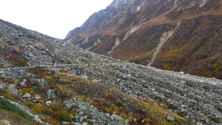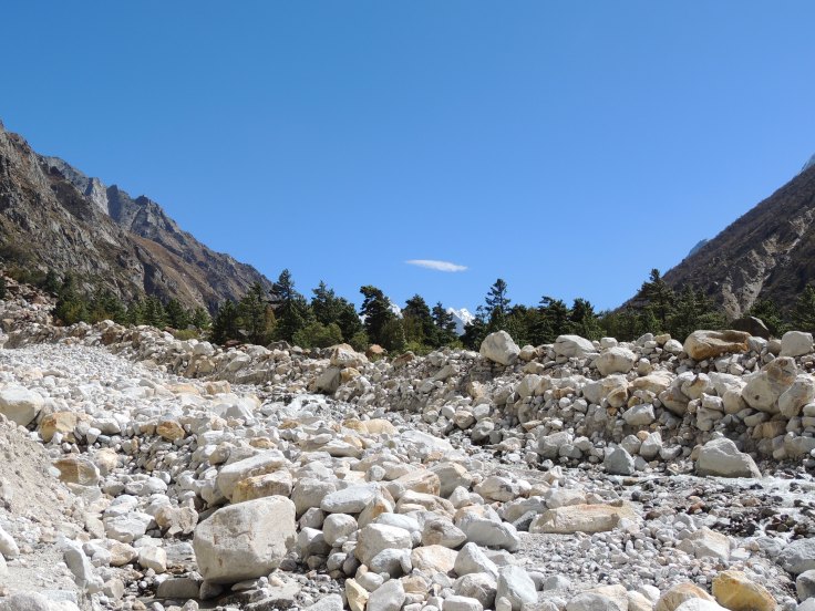चिडबासानंतर हरित वृक्षराजी तुरळक होत जाते. आपण अक्षरश: हिमनद्यांबरोबर वाहून आलेल्या माती, दगडधोंडयांच्या प्रदेशात प्रवेश करतो. चिडबासाचा चेक पोस्ट सोडताच अगदी खडबडीत आणि रूक्ष रस्ता सुरू होतो! एकीकडे खाली खोल दरीत वाहणार्या भागीरथीचा कानावर येणारा आवाज आणि डाव्या बाजूला भुसभुशीत दगडमातीचे डोंगरांचे सुळके आणि अंतरा-अंतरावर दगडमाती वाहून गेल्यामुळे नष्ट झालेली भिवविणारी पायवाट! चिडबासाच्या पुढे तीन किलोमीटर अंतरावर ‘गिला पहाड’ म्हणून ओळखले जाणारे धोक्याचे क्षेत्र येते. हा शेवटचा टप्पा “रॉक फॉल” क्षेत्र असल्याने जीव मुठीत घेऊन, सतत डाव्या बाजूला मान वाकडी करून सावधतेने मार्गक्रमण करीत होतो. विशेष म्हणजे जिथे रस्ता वाहून गेलेला आहे किंवा कधीही कोणत्याही क्षणी उंचीवरून दगडगोटे घरंगळत येण्याची शक्यता आहे त्याच टप्प्यात नेमकी धाप लागणारी चढण-उतरण असे! संध्याकाळचे वेळी हिमालयीन ‘भरल’ सारखी जनावरे परतीच्या मार्गावर असतात. त्यामुळे त्यांच्या पायाने एखादया जरी दगडाचा चेंडू झाला तरी कपाळमोक्षच! अंदाजे ८ ते ९ डोंगर वळणं ह्या “रॉक फॉल” क्षेत्राने व्यापली होती. त्यामुळे शेवटचे दोन किलोमीटरचे अंतर अगदी जीव मुठीत धरून पार केले. आमच्या सोबत असलेला गाइड आणि इतर ग्रुप सोबत असलेले गाइड सर्वांना, “चलो जल्दी चलो, ध्यान रखो,” अश्या सतत सूचना देत होते. “रॉक फॉल” क्षेत्राच्या सुरुवातीस आणि शेवटी वन विभागाचे सतर्क करणारे फलक आहेत. “रॉक फॉल” क्षेत्र पार केल्यावर अक्षरशः दगडगोटयांवर कसरत करीत वाट शोधावी लागते. गौमुख-तपोवनाचा ट्रेक आव्हानात्मक आहे असे का म्हणतात ह्याचा नेमका प्रत्यय ह्या टप्प्यात येतो. शेवटचा टप्पा अगदीच नकोसा वाटू लागतो! एका डोंगराला वळसा घालून दगड गोट्यांना पार केल्यावर एका vantage point शेडपाशी येऊन पोहोचतो आणि तेथून एका दृष्टीक्षेपात चौफेर पर्वत रांगांनी वेढलेले भोजबासा नजरेस पडते. समोर “भागीरथी सिस्टर्स” ज्याला ‘भागीरथी मासिफ’ असे ही म्हटले जाते, ती पर्वत शिखरे दिसू लागतात. आणि आपला दिवसभरचा शीण आणि शेवटच्या टप्प्यात सतत मनात घोंगावणारे भय सुद्धा कुठच्या कुठे पळून जाते!