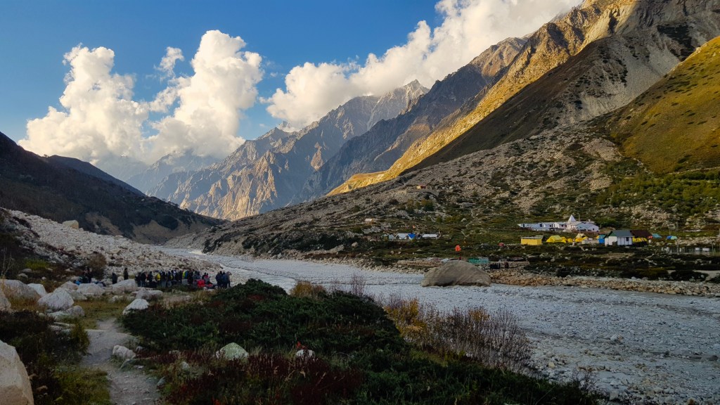 संध्याकाळी आमच्या पडावावर पोहोचल्यावर आम्हाला पाच जणांसाठी एक तंबू दिला गेला. चहा-पानाची सोय झाली. आम्ही आमच्या खांद्यावरून आमच्या बॅकपॅक उतरवून निवांत झालो. राम बाबा आश्रम सर्व मूलभूत सोईनी सुसज्ज होता. अगदी आमच्या आश्रमामध्ये तंबूमध्ये लोखंडी कॉट आणि त्यावर बिछाने, रजई पांघरूण सर्व काही सोई सुविधा होत्या. थोडक्यात भोजबासाचे पूर्णपणे व्यापारीकरण झालेले आहे! ह्या तंबूंना मजबुती देण्यासाठी कमरेइतक्या उंची पर्यंत दगडी भिंती उभारलेल्या आहेत. एक स्वयंपाक घराची संपूर्ण दगडी झोपडी तयार केलेली आहे. भोजबासामध्ये अनेक ट्रेक आयोजित करणाऱ्या कंपन्यांचे नदीच्या काठाने लाल-पिवळे रंगाचे तंबू वसलेले दिसतात.