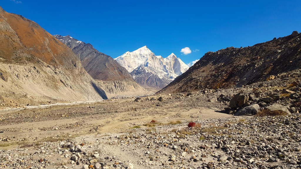 आम्ही सकाळी दहा वाजेपर्यंत तपोवनामध्ये सभोवारची उत्तुंग पर्वत शिखरे न्याहाळण्यात आणि मौनी बाबांशी हितगुज करण्यात वेळ व्यतीत केला. सकाळच्या ऊनामध्ये चमचमणारी पर्वत शिखरे पाहातच आमचा नाश्ता झाला आणि साडे दहाच्या सुमारास तपोवनामधून गौमुखच्या दिशेने उतरण्यास सुरुवात केली. आश्रमापासून ते तपोवनाचे जणू प्रवेशद्वार असलेल्या शिळेपर्यंत आकाश गंगेच्या काठाने चालत असताना मी किती वेळा मागे वळून त्या शिवलिंग पर्वताकडे पहिले असेल याची मोजदाद नाही. त्या शिवलिंग पर्वताने आणि तपोवनामधील वातावरणाने जणू मी भारावून गेले होते. शिवलिंग पर्वताच्या छायेत असलेल्या तपोवनामध्ये जणू चुंबकीय आकर्षण असावे आणि आपण जागीच खिळून गेलो आहोत अशी भावना होऊ लागली! खरं तर तपोवनामध्ये अजून एक दिवस व्यतीत करण्यास आवडले असते! परंतु ट्रेकवेदाच्या कृपेने आमचे दिवसांचे गणित कोलमडलेले होते. शिवलिंग पर्वताला अखेरचा दंडवत करून मी त्या भयावह वाटणाऱ्या उतरणीवरून हळूहळू चालू लागले. विलास जलद गतीने तो उभा चढ उतरून पुढे कधी निघून गेला हे सुद्धा समजले नाही. आज कोणतीही घाई-गडबड नव्हती. त्यामुळे मी माझ्या पायाला जपत सावधानतेने मनोज गाइडच्या मदतीने खाली उतरत होते. तपोवनाकडे जाताना जितकी चढाई बिकट वाटली होती, त्याच्या दुप्पटीने तो चढ उतरताना भीतीदायक वाटत होता. चुकूनही पाय घसरला तर थेट गौमुखातच जाऊन विसावा मिळेल अशी परिस्थिती होती! संपूर्ण भागीरथी शिखरे आणि त्यांच्या पायथ्याशी विस्तीर्ण पसरलेले गंगोत्री हिमनदीचे क्षेत्र तपोवनातून खाली पायउतार होताना दृष्टीक्षेपात येत होते. कोसळलेल्या दरडी, हिमनदीचे भग्न तुटून विखुरलेले महाकाय अवशेष काही क्षण भयावह वाटले! त्यामुळे तपोवनातून गौमुखकडे उतरून जाताना हृदयातील धडधड वाढलेली होती! केवळ दगड-गोटे आणि खडकाळ प्रदेश! कोणत्याही क्षणी हिमनद्यांचे असंख्य निखळलेले, तुटलेले भाग घरंगळत येऊन आपल्याला त्यांच्या ढिगाऱ्याखाली गुडूप करू शकतील असाच प्रदेश होता! साधारण दीड तासाच्या संयमी पायपिटीनंतर तपोवनाकडून गौमुखाच्या तोंडापाशी येऊन पोहोचलो.