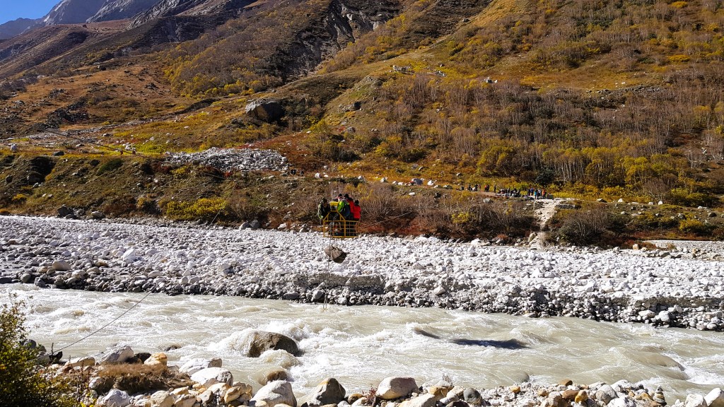 मनोजने आम्हाला सांगीतले की, गौमुख ग्लेशियरकडे जाणारा, पूर्वापार यात्रेकरू ये-जा करीत असलेला रस्ता काही वर्षांपूर्वी पूर्ण वाहून गेल्याने भागीरथीच्या पात्राला एका छोट्या ट्रॉलीमधून पार करून पलीकडच्या तीरावर जावे लागते. तिथून गौमुख -तपोवनच्या दिशेने ट्रेकरूट पुढे जातो. खरी मेख तिथेच होती! भागीरथीच्या पात्राला पार करण्यासाठी भल्या पहाटे तीन-चार वाजताच इतर ट्रेक कंपनीचे गाइड रांग लावून उभे होते! आम्ही आपले सकाळी मनोजने सूचना दिल्याप्रमाणे साडेसात वाजताच्या दरम्यान तयार होऊन ट्रॉली पॉइंट जवळ जाऊन उभे राहिलो. तिथे एकच हलकल्लोळ माजलेला होता. अनेक जण पैलतीरावर जाण्यासाठी आपसामध्ये चढाओढ करत होते. प्रत्येक ट्रेक कंपनीचे गाइड आणि पोर्टर एकमेकांसोबत प्रथम कोणाचा ग्रुप जाणार ह्यावरून वाद घालत होते आणि ट्रॉली आली की त्यावर चढण्यासाठी गर्दी आणि स्पर्धा होत होती. सर्वच सावळा गोंधळ होता! आम्ही चौघे जण तिथे शांत उभे राहून ह्या सर्व घटनांचे निरीक्षण करीत, आमचा नंबर केव्हा येणार?? ह्याच्या प्रतीक्षेत होतो. इतर ट्रेक कंपनीचा कंपू मोठा असल्याने त्यांना प्राधान्य मिळत होते. आमच्या मनोज गाइडने मात्र हाताची घडी घालून केवळ तिथे जेव्हा संधी मिळेल तेव्हा पार करू असे धोरण अवलंबले होते जणू! आमचा धीर सुटू लागला. दुपारचे साडे अकरा वाजून गेले. तरी आम्ही “आप कतार मे हो”!! मग मात्र आम्ही मनोजच्या मागे तगादा लावला. साधारण दुपारी १२.३० वाजता आम्ही त्या ट्रॉलीच्या सहाय्याने नदीचे पात्र पार करून दुसऱ्या तीरावर गेलो. भोजबासाला भागीरथी नदीचे पात्र पार करण्यासाठी हाताने दोर ओढून बास्केट सारख्या ट्रॉलीमधून नदी पार करणे म्हणजे अत्यंत धोकादायक, असुरक्षित आणि केविलवाणा प्रकार!
