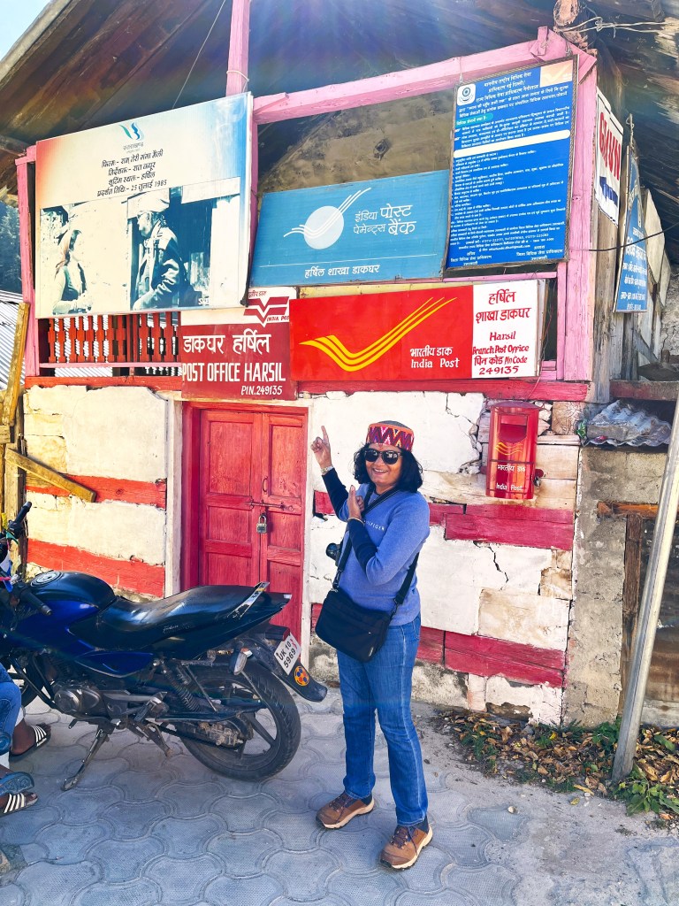 पायी केलेल्या रपेटीमुळे एव्हाना पोटात भुकेने कावळे ओरडू लागले होते. माझ्या गाडीवानाने आमची गाडी पुन्हा हर्षिल गावाकडे वळवली आणि हर्षिलच्या मुख्य रस्त्यावरच असलेल्या “हरशिला रेस्टॉरंट” समोर उभी केली. मला मनसोक्त गरमागरम सूप आणि मोमोजची मेजवानी मिळाली. माझी रसना तृप्त झाली! त्यानंतर हर्षिल गावामधील “राम तेरी गंगा मैली” ह्या चित्रपटामुळे प्रसिद्ध झालेले पोस्ट ऑफिस पहाण्यासाठी गेले. हर्षिल गावात असलेल्या पर्यटक निवासाच्या दिशेने गावातील छोट्या रस्त्यावरून चालत मी पोस्ट ऑफिस पाशी येऊन पोहोचलो. पोस्ट ऑफिसच्या बाहेर मोठे फिकट झालेले राम तेरी गंगा मैली चित्रपटाचे पोस्टर लावलेले दिसले! सर्व दूर सफरचंदांच्या बागा, चौफेर पर्वतरांगा यांनी वेढलेले हर्षिल गाव खूपच निसर्गरम्य होते.