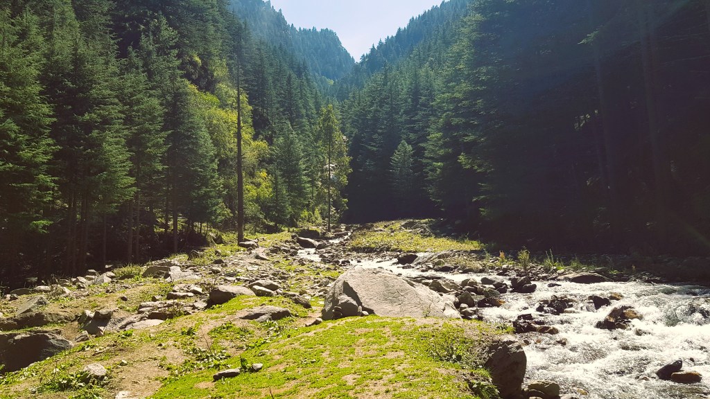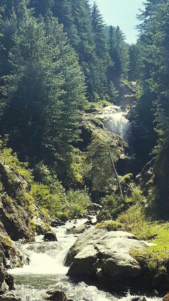 मी गाडीतून उतरून चालत डाव्या बाजूला असलेल्या पायवाटेवरून धबधब्याच्या दिशेने निघाले. अर्थात इतक्या वर्षानंतर त्या ठिकाणांमध्ये आमूलाग्र बदल झालेला असणे अगदीच अपेक्षित होते. पण अगदी महामार्गालगतच अंदाजे दहा ते पंधरा मिनिटे काही अंतर पायी चालत गेल्यावर आपण एका धबधब्याच्या वाहत्या झऱ्यापाशी येऊन पोहोचतो. अगदी जंगल सदृश वाटावे अश्या देवदार आणि पाईन वृक्षांच्या मधोमध एक पाण्याचा प्रचंड मोठा प्रपात ‘धबाबा लोटती धारा’ ह्या उक्तीप्रमाणे वाहात होता.