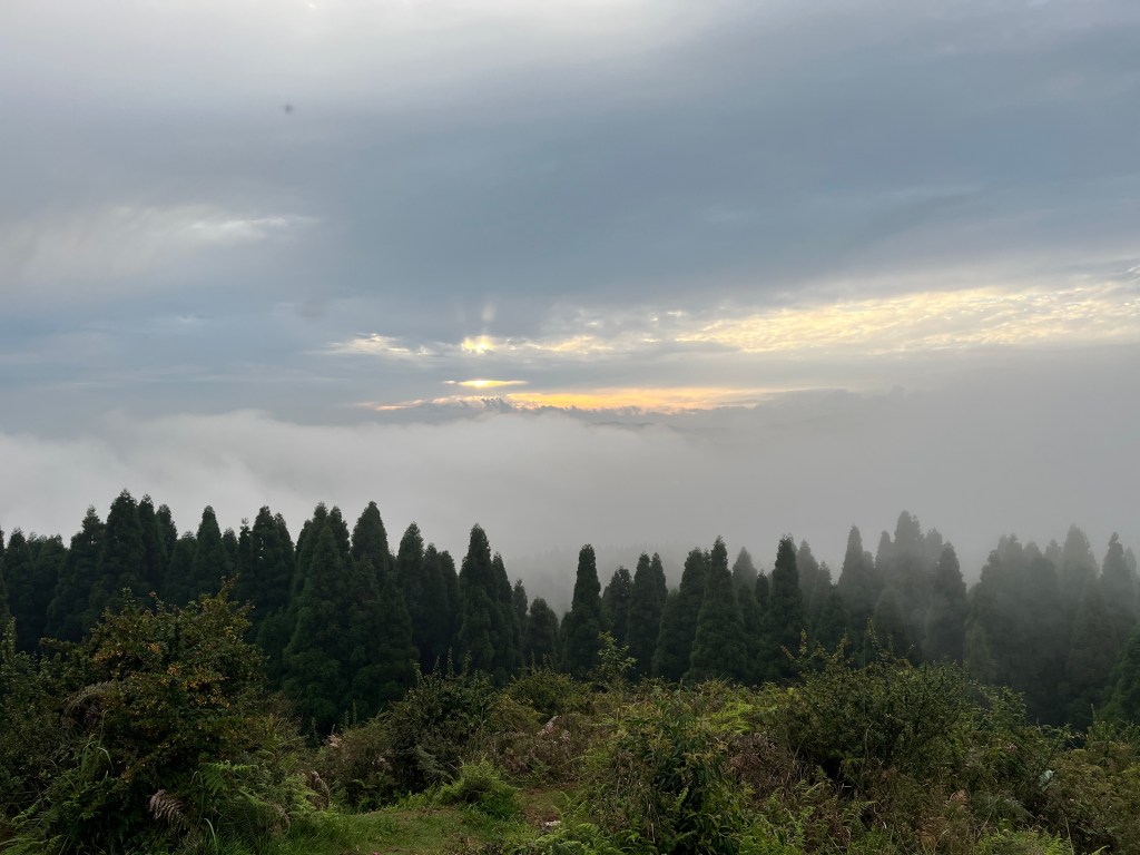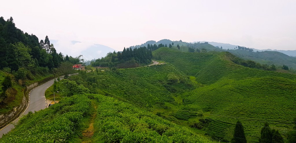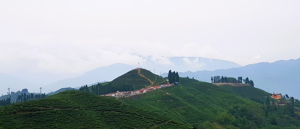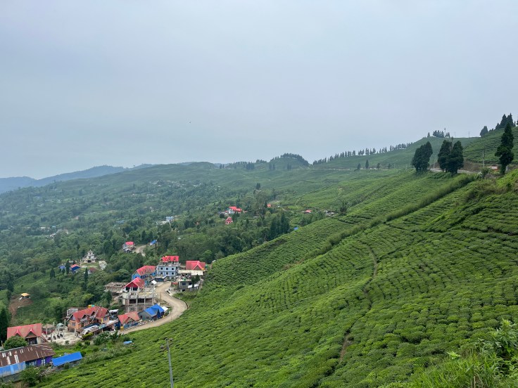 बाजाराचा भाग संपताच नेपाळी लोकांची टुमदार हिरव्या-निळ्या अश्या वेगवेगळ्या रंगामधील घरे नजरेस पडू लागली. गाव संपताच वळणा-वळणाचा रस्ता सुरू झाला. दूर निळ्या-करड्या रंगांच्या पर्वतरांगा आणि त्यावर अलगद ढगांचे पुंजके विहार करीत होते, नजरेच्या टप्प्यापर्यंत अखंड रस्त्यावर उंच उंच टेकड्या चहाच्या हिरव्यागार मळयांनी व्यापलेल्या होत्या. खूपच निसर्गरम्य प्रदेश होता. साधारण एक तासामध्ये आम्ही कन्यमच्या व्यू पॉइंट जवळ पोचलो. बहुदा शनिवार असल्याने पर्यटकांची खूप गर्दी होती. सभोवार नजर फिरवताच अत्यंत विहंगम दृश्य नजरेस पडले.