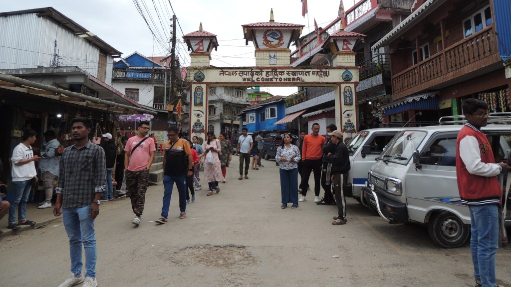 आम्ही चेक पोस्टजवळ गाडीतून उतरलो. चक्क दोन लाकडी बांबू म्हणजे ‘पशुपती फाटक’ दोन देशाच्या सीमा विभागत होते! फाटकाच्या एका बाजूला पश्चिम बंगालच्या सुखिया पोखरी पोलीस स्टेशन हद्दीत येणारा भारतीय चेक पोस्ट आणि कस्टम ऑफिस होते तर फाटक ओलांडताच नेपाळ मधील पोलीस चेक पोस्ट! इथे पर्यटकांना फोटो ओळखपत्र दाखवून तेथील रजिस्टरमध्ये भारतामधून नेपाळमध्ये आपण प्रवेश केल्याचा वेळ, नाव, दूरध्वनी क्रमांक इत्यादि तपशील रीतसर नोंद करून मगच पुढे जाण्याची परवानगी असते. फक्त भारतीय आणि नेपाळी नागरिकच ह्या पशुपती फाटकामधून ये-जा करू शकतात. परदेशी नागरिकांना सीमा पार करण्याची परवानगी नाही. इथे फोटोग्राफी करण्यास मनाई आहे. पण फाटकापासून काही पावले पुढे चालून नेपाळच्या प्रवेशद्वाराजवळ आपण फोटोग्राफी करू शकतो! आम्ही आमचा आवश्यक तपशील, प्रवेशाची वेळ नोंद केली आणि चक्क पायी आपल्या देशाची सीमा पार करून नेपाळ मध्ये – परदेशात प्रवेश केला! फारच मजेशीर अनुभव! काय योगायोग असावा माहीत नाही, पण मला २५ वर्षांपूर्वी केसरी टुर्स मार्फत मिरिक दर्शन करून काकरबिट्टा मार्गे केलेल्या नेपाळ सहलीची आठवण ताजी झाली! आज पुन्हा २५ वर्षानी नेपाळच्या हद्दीत प्रवेश केला होता!