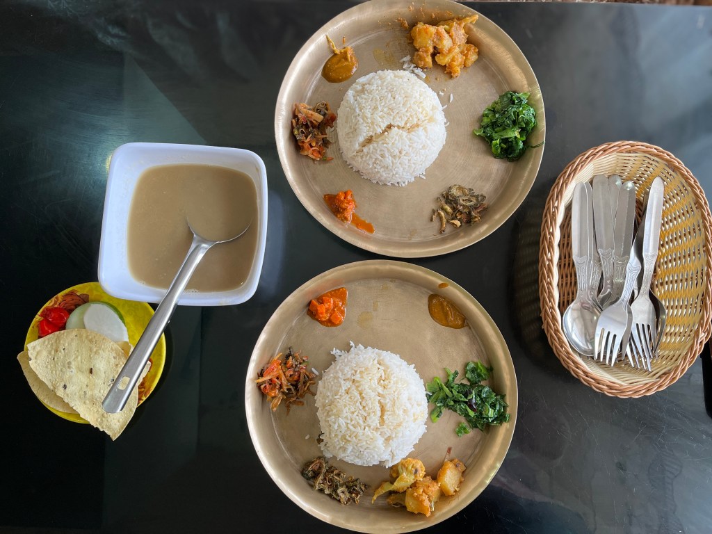 कन्यमच्या निसर्गरम्य वातावरणाचा आनंद घेऊन आम्ही परतीच्या वाटेवर फिक्कल येथे ‘सोनाम रेस्टॉरंट’मध्ये नेपाळी थाळीचा आनंद घेत पोटपूजा केली. नेपाळी थाळी म्हणजे पारंपरिक नेपाळी जेवण! पितळी धातुच्या गोल ताटामध्ये मध्यभागी भात आणि त्याच्या आजूबाजूला गोलाकार इतर पदार्थ वाढलेले असतात. सोबत हिरव्या पालेभाज्या, चटणी, इतर हंगामी भाज्या, सॅलड, आंबवण केलेल्या भाज्यांचे लोणचे, पापड, दही आणि पौष्टिक ‘दाल’ ह्याची साथ-सोबत! हे सर्व पाहूनच आपली रसना जागृत होते! अतिशय साधी आणि सात्विक अन्न घटकांनी परिपूर्ण असलेली शाकाहारी थाळी अतिशय रूचकर होती. नेपाळी खाद्य संस्कृतीमध्ये थाळीला विशेष महत्त्व आहे. पारंपरिक नेपाळी थाळीमध्ये सहा वेगवेगळ्या स्वादाचे परिपूर्ण संतुलन असते. थाळीमध्ये आवर्जून खारट, गोड, आंबट, कडू, मसालेदार आणि तुरट अश्या चवीचे पदार्थ समाविष्ट केलेले असतात. किंबहुना अनेक व्यंजनांनी परिपूर्ण असलेली जेवणाची थाळी ही नेपाळी पाहुणचार आणि आदरातिथ्याचे प्रतीक असावी!