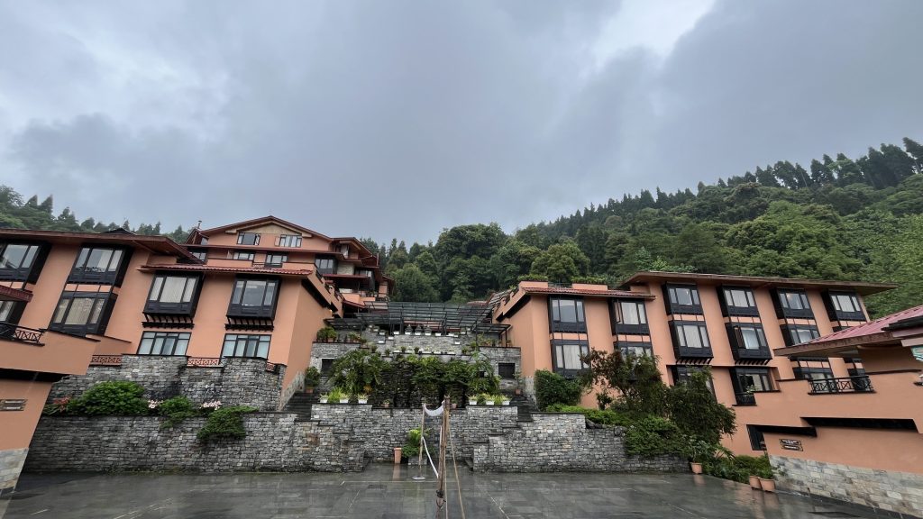 बऱ्याच दिवसांनी माझ्या शरीराचा अलार्म मोबाइलच्या अलार्मपूर्वी वाजला. लवकरच जाग आली. बाहेर पाऊस रिमझिम करीत होता. चहा घेतला आणि रिसॉर्ट परिसर सर्वेक्षणासाठी खोली बाहेर निघाले! आमच्या खोलीतून बाहेर पडताच उजव्या बाजूकडून वरच्या दिशेला रिसोर्टच्या ‘सन डेक’कडे जिना जात होता. जिन्यावरून आम्ही सन डेकवर गेलो आणि रिसॉर्टचा संपूर्ण परिसर नजरेस पडला. डोंगराच्या कुशीत गर्द हिरव्या वनराजींच्या पार्श्वभूमीवर चुंबी रिसॉर्ट स्थित आहे. डाव्या बाजूच्या टेकडीवर वसलेले पेलिंग आणि समोर साक्षात कांचनजंगा पर्वत शिखरांचे दर्शन होत होते आणि त्याच्या पायथ्याशी विस्तारलेल्या पर्वतरांगा आणि दरीखोरी! रिमझिमणाऱ्या पावसामुळे भवतालचा परिसर धुक्याची चादर ओढून रमणीय दिसत होता. विविध पक्षांचे मंजुळ आवाज, वृक्षराजी आणि डोंगर कड्यावरून चाललेली ढगांची लगबग पहात खऱ्या अर्थी शुभ सकाळ झाली! आमचा गाडी चालक ‘मिस्टर लोचेन’ हा स्थानिक म्हणजे पेलिंगचाच रहिवासी असल्याने सकाळी आमच्या आधीच रिसोर्टच्या वाहनतळामध्ये दत्त म्हणून हजर होता. आम्ही लवकरच रिसॉर्टमधून पेलिंग दर्शनासाठी बाहेर पडलो.