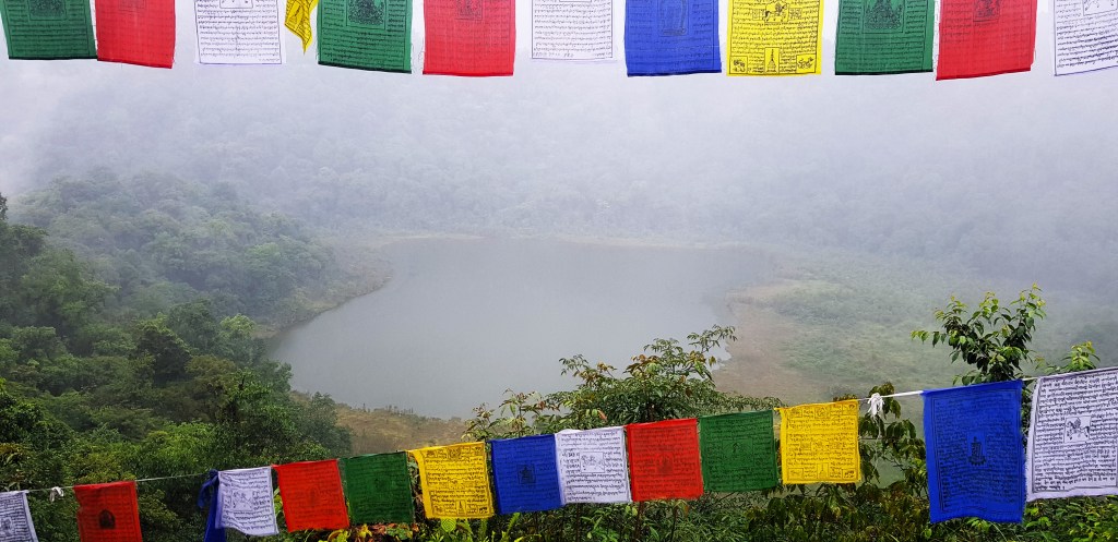 आम्ही भर पावसात जंगलामधील पायवाटेने एक छोटा ट्रेक करून व्हयू पॉइंटपाशी जाऊन थडकलो. रिमझिम पावसाने चिंब ओले करून टाकले होते. व्हयू पॉइंट वरून खालच्या दिशेला तलावाचे विहंगम दृश्य नजरेस पडले. तलाव चहुबाजूंनी गर्द जंगलांनी व्यापलेल्या टेकड्यांनी वेढलेला होता. तलावाच्या बाजूनेच रंगीत प्रार्थना ध्वज लावलेले होते. अवघा परिसर धुक्यात लुप्त झालेला होता. टेकड्यावरील वृक्षराजीच्या अंगा-खांद्यावर ढग अलगद विसावलेले होते. व्हयू पॉइंटच्या दुसर्या बाजूस ‘स्टोन होम स्टे’ दिसत होता. जंगलातून पायवाटेने चढून आल्याखेरीज या होम स्टेमध्ये जाण्याचा कोणताच पर्याय नव्हता. चौफेर रंगीत प्रार्थना ध्वज आणि शांतता! ध्यानस्थ होऊन निराकाराशी संवाद साधण्यासाठी अगदीच पूरक वातावरण. अशा रम्य आणि पवित्र मानल्या जाणाऱ्या परिसराची धार्मिक महती तर असणारच! मग त्याबाबत दंतकथा ओघाने असणारच नाही का! लोककथांनुसार ‘खेचीयोपालरी’ हा दोन अक्षरांचा मेळ असलेला शब्द आहे. खेचीयो म्हणजे उडत्या योगिनी किंवा तारा अर्थातच अवलोकितेश्वराचे स्त्री रूपातील प्रकटीकरण आणि पालरी म्हणजे महाल किंवा रहाण्याची जागा-थोडक्यात पद्मसंभवांचा महाल!