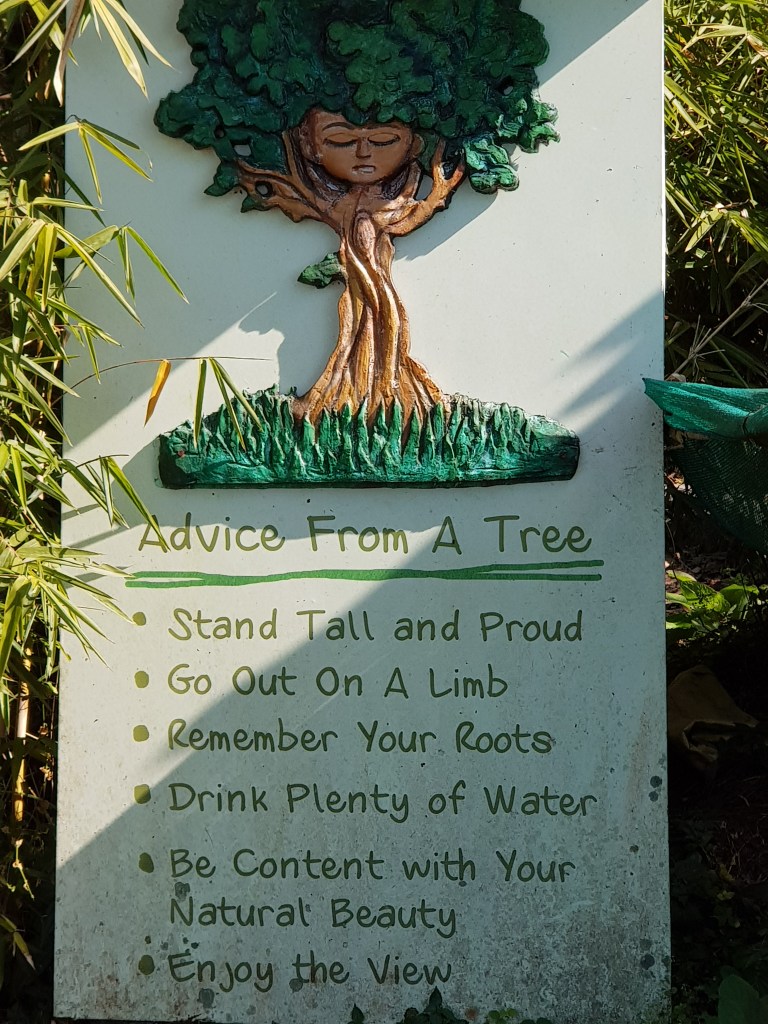 ह्या उद्यानात फेरफटका मारताना, पायवाटेवरून चालताना पक्ष्यांचे आवाज, फुलांचे रंग, सुखद हिमालयीन वाऱ्याची झुळूक आणि हिमाच्छादित पर्वत शृंखलांचे विहंगम दृश्य आपल्याला अगदीच सुखावून जाते. विविध टप्प्यांमध्ये विकसित केलेल्या ह्या उद्यानाचा फेरफटका मारताना थकल्यास खुशाल एखाद्या कोपर्यात झाडाखाली असलेल्या बाकड्यावर बसून निसर्गाच्या कुशीत पहुडल्याचा आनंद घेत काही क्षण निसर्ग संगीत ऐकत समोर दिसणार्या हिम पर्वतांशी हितगुज करीत बसावं! स्वच्छ वातावरणात दूरवर पसरलेली बर्फाच्छादित शिखरे स्पष्ट दिसत होती. बागेत फिरताना एखाद्या निसर्ग कवितेत हरवून गेल्यासारखे वाटले! ह्या बागेत फिरताना एका ठिकाणी “Advice From A Tree” च्या फलकाने माझे लक्ष वेधून घेतले!