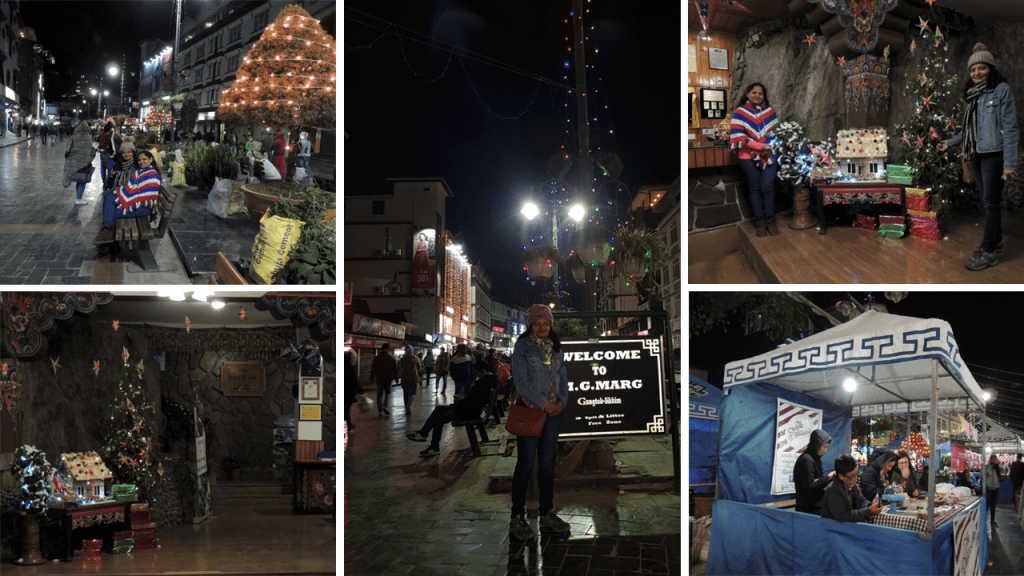एव्हाना काळोख झाल्याने आम्ही आमच्या रिसॉर्टचा रस्ता पकडला! दिवसभर स्थळ दर्शनाच्या पायपिटीच्या उतार्यासाठी संध्याकाळचा चहा तर हवाच! चहा घेऊन आम्ही परत गंगटोकच्या प्रसिद्ध एमजी मार्गावरून फेरफटका मारण्यासाठी सज्ज झालो. नाताळासाठी संपूर्ण एमजी मार्ग रोषणाईने झगमगत होता. अगदी नीटनेटका आणि स्वच्छ असा गंगटोक शहराचा मुख्य बाजारपेठेचा हा भाग मला उगाचच परदेशातल्या सिटी सेंटरची आठवण देऊन गेला. गंगटोक शहरात ‘सांता बाबा’च्या स्वागताची जय्यत तयारी केलेली होती. एमजी मार्गावर अनेक खाद्य पदार्थ, वस्तूंचे स्टॉल लागलेले होते. अतिशय उत्साहाचे वातावरण होते. हवेत गारवा वाढलेला होता. आम्ही लोकरी कपड्यांनी बंदिस्त होऊन सिक्कीमच्या हिवाळी मोसमाचा आनंद घेत होतो! आम्ही बराच वेळ तिथे रमलो, एका रेस्टोरंट मध्ये थुकपा आणि मोमोज् ह्यांचा आस्वाद घेऊन पुन्हा रिसॉर्टकडे माघारी परतलो. दुसर्या दिवशी आमची उत्तर सिक्किमची सफर सुरू होणार होती!