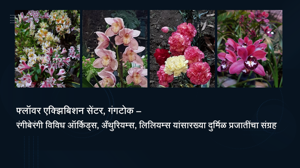 गंगटोक शहराच्या मध्यवर्ती भागात असलेले हे फ्लॉवर एक्झिबिशन सेंटर आणि त्याच्या वरच्या भागात असलेले रिज पार्क ही ठिकाणे गँगटोकच्या स्थळ दर्शनात जरूर समाविष्ट करण्याजोगी आहेत. गंगटोकच्या एम जी मार्गावरून अगदी चालत जाण्यायोग्य अंतरावर व्हाइट मेमोरियल हॉल जवळ हे एक्झिबिशन सेंटर आहे. येथे वर्षभर फुलांचे प्रदर्शन सुरू असते परंतु एप्रिल-मे महिन्या मध्ये भरविले जाणारे ऑर्किड्सचे वार्षिक प्रदर्शन खास असते. रंगीबेरंगी विविध ऑर्किड्स, अँथुरियम्स, लिलियम्स यांसारख्या दुर्मिळ प्रजातींचा संग्रह हयाठिकाणी केलेला पहावयास मिळतो. ह्या पुष्प प्रदर्शनीमधील कृत्रिम तलाव आणि त्यावर बांधलेला छोटासा पूल, त्यामध्ये तयार केलेले कारंजे हे सर्व काही आपल्याला अगदी फोटोग्राफीसाठी मोहात टाकते! येथे फुलांच्या बिया आणि रोपे विक्रीस उपलब्ध असतात.
